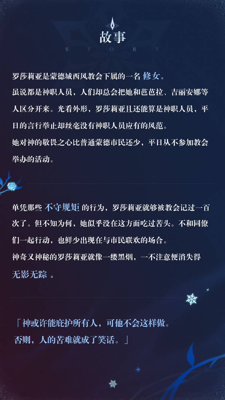 米哈游今日公布了《原神》最新角色——棘冠恩典·罗莎莉亚的介绍与宣传片,她是一位除了打扮哪里都不像神职人员的修女,总是单独行动,冷淡的言行中透着锐利。什么都可以商量,除了加班!