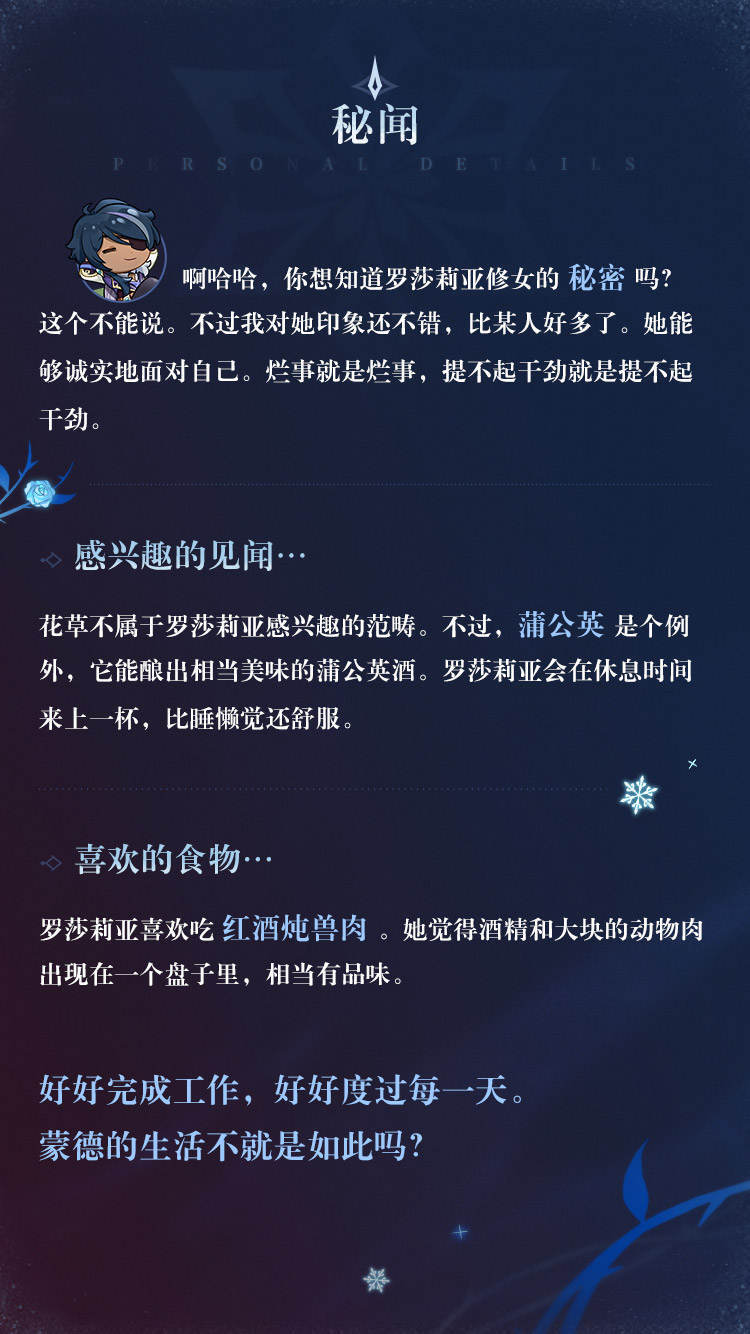 对神的敬畏之心比普通蒙德市民还少,平日从不参加教会举办的活动。她犹如一道黑影,穿行于蒙德城各处。