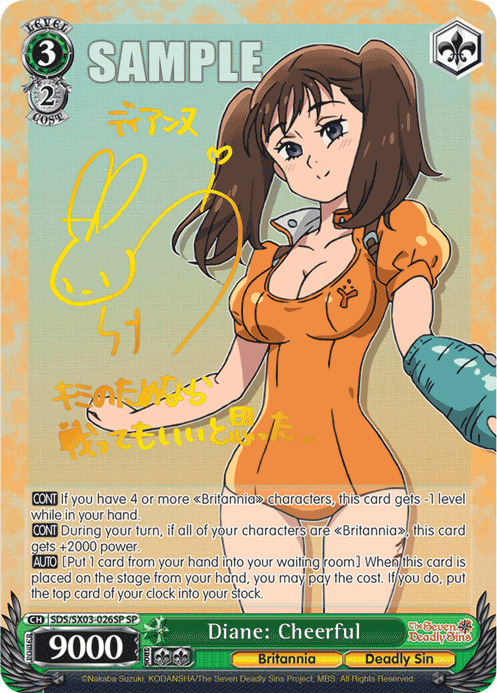 【自】[手卡1张《Britannia》角色放置到休息室]这张卡攻击时,你可以支付这个费用。若如此做,将对手卡组底2张放置到休息室,给予对手X点伤害。X等于那些卡中高潮数量。(伤害可以取消)