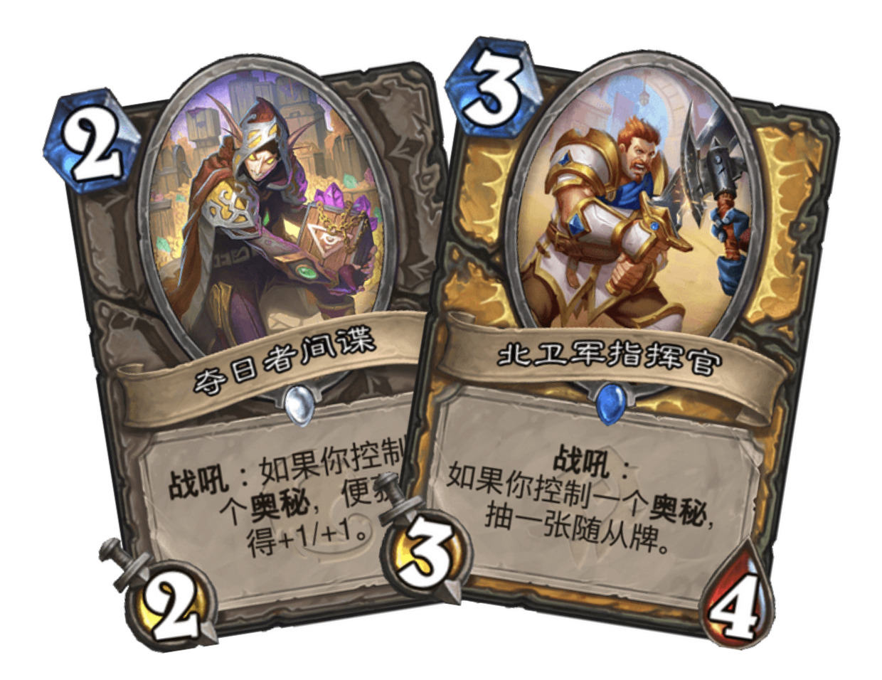 毫不夸张的说,逝者之剑无疑是全套牌甚至整个新版本中最强单卡。只要2费的一把3耐久度的刀,你可以做的事情有:从牌库中过滤3张奥秘牌,自动挂上3个奥秘,以及稳定配合夺日者间谍和北卫军指挥官。拥有如此强大的能力我感觉这把刀要吃顿好的了。开局一把刀我认为至少能增加20%的胜率。