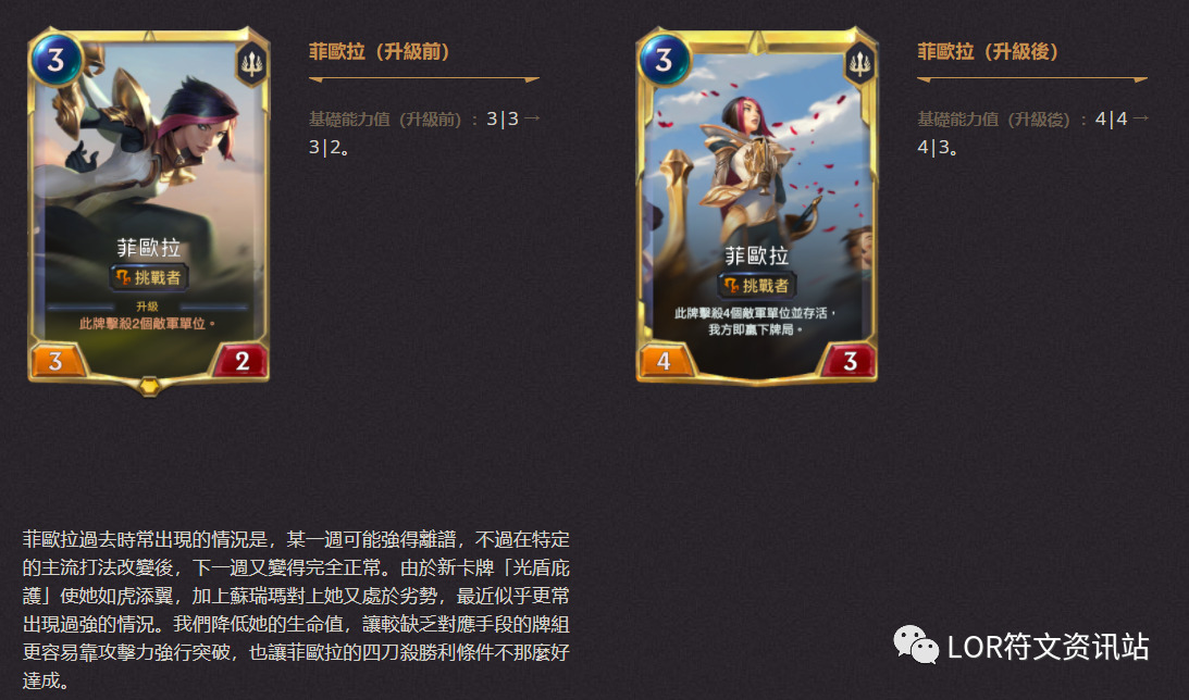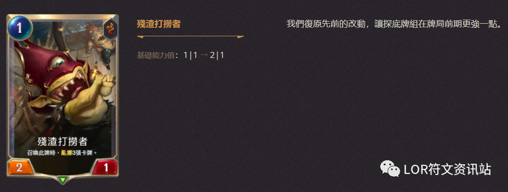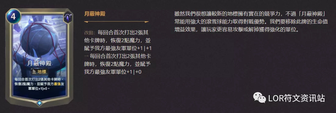 在LOR这个防守方优势的游戏里,一点生命值的价值是要比一点攻击力高很多的,参考德玛西亚的广场削弱+1血后直接掉下神坛,神殿削弱后的作用就变成了每回合回复两点法力,+1攻可以忽略不计,那么4费下的投资,要到6费回合才能回本,7费回合才能赚利息,更何况,我们带神殿很多时候为了用它养大月男/卡牌,利用升级后的英雄作为获胜手段。大胆预言,神殿这波削弱会直接退出历史舞台,变得无人问津。