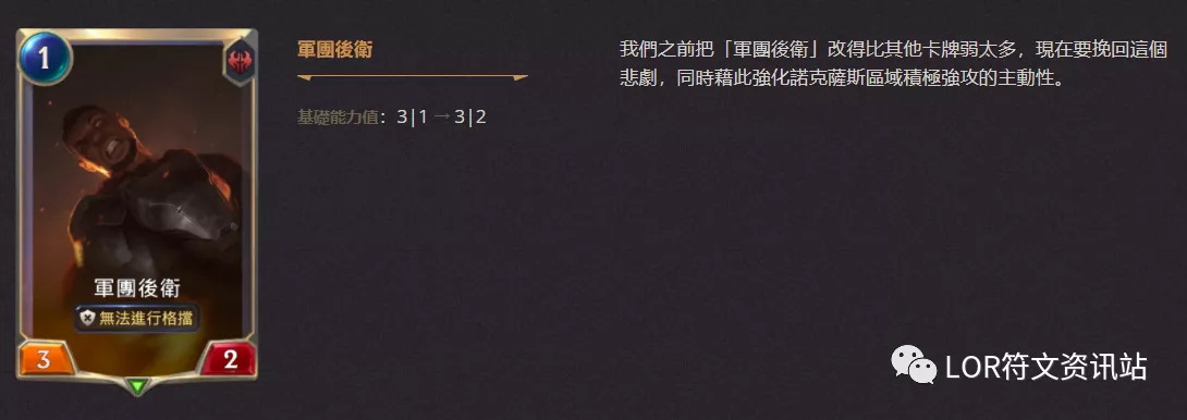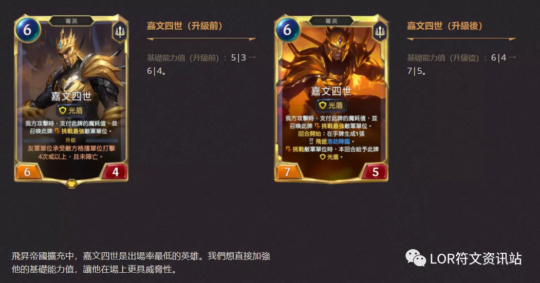皇子的问题是僵硬,虽然6费回合直接进攻可以抢一个攻击频率,但同时意味着失去了保存法力值以反制对手的可能,+1+1并没有改变核心问题,即光盾会被盛宴、深宵断魂、秘术射击、沉默反制,虽然多了一血能够在破盾后逃离大部分直伤的斩杀线,但6费的时候对方的最强生物往往也有4点以上攻击了,还是一个直伤解决的事。虽然大部分时候1血比1攻重要,但在皇子这里我反而觉得多出的1攻更有价值,至少可以让这位本就不强的德玛大兵可以吃掉更强一点的德玛超级兵(指希思黎雅)。要想让皇子引领德玛西亚复国,需要的是减费而非增加身材。