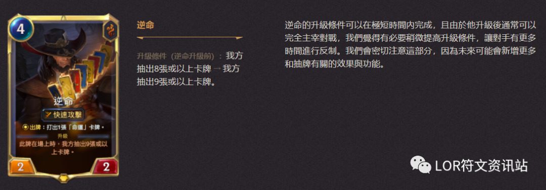 这么一通分析可能有人会觉得:对哦,月男白赚了卡差,这些卡2费不亏模,砍到3费略亏模,合理!但这里又涉及到另一个LOR里很重要的概念——节奏(这个概念一般只存在于前中期有生物站场的卡组,只控场解场利用后期特殊手段或OTK制胜的控制卡组不存在节奏),这个概念很难用三言两语解释清楚,比较简单的理解方法是,在每回合把当前回合的每一点费用和现有手牌对应后打出最大的价值,就是赚取了节奏。就以月男为例,2费武器时,我们可以在3费打出夜临减费+月男,下回合枪+另一张牌+切出另一把枪,基本可以清理干净快攻的场面,这也就是为什么缺乏解牌和AOE的巨神峰在佐伊和月男登场后反而成了快攻卡组的噩梦,就因为他们曲线低、有卡差、还不亏节奏,而面对中速、控制卡组时,这两位英雄也毫无弱点,升级后的佐伊和月男有多恐怖想必不需要我描述。