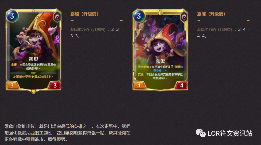 巨神峰第一个版本是想主推艾欧尼亚巨神峰支援体系的,然而中道崩殂,两个地区的支援牌各自找到了最佳伙伴德玛西亚,测试一段时间后发现强度仍难堪大用,故彻底坐上了冷板凳。璐璐升级前就是一张不亏模的合格卡,升级后给的buff相当好用,这次加强了一攻,隐隐有抬头的迹象,但支援套笨重、单兵能力太弱导致比大部分吃牌序的卡组更吃牌序、缺乏终结手段的问题仍未解决,恐难在天梯中有竞争力。