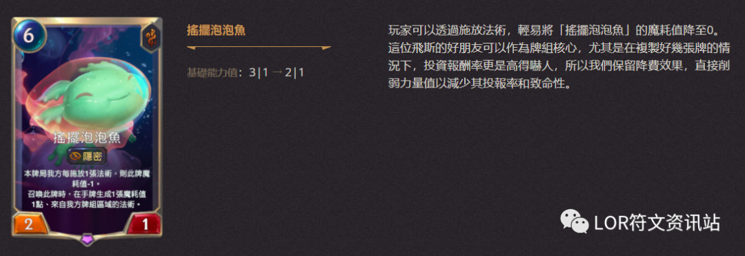 也因此私以为泡泡鱼这一点攻击力的削弱有些过了,过牌数量的减少、卡牌升级难度的加大,已足以让这套卡组掉下神坛,何苦为难这只在除了卡牌小鱼外的卡组里登场率≈0的泡泡鱼呢?