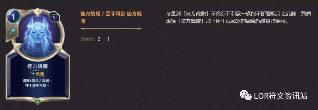 在上图中,设计师对月男武器削弱的理由可以说是很整蛊了——“原本设计目标是比同费用可收集卡牌稍微强一点,现在觉得太强了”。大哥,你没发现月男和佐伊是同一个性质的东西吗?他们的强大之处并不是自身所创造的 衍生单卡超模(佐伊要亏费找天界,月男的枪单卡基本符合2费模型),而是因为他们是白嫖的!在面对快攻卡组外的其他卡组时,双方或多或少会有空过浪费费用的情况出现,而月男、佐伊则可以利用自身的衍生卡让这些本应浪费掉的费用最大化利用,这些都是实打实的卡差,你抽一我抽一的游戏,卡差天下第一。