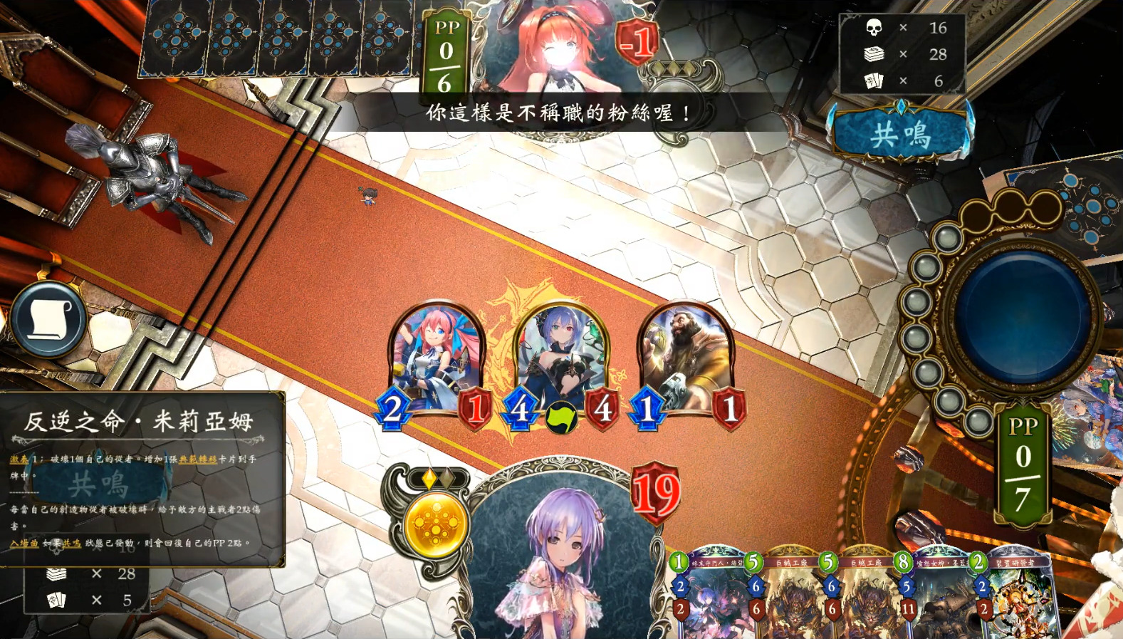 走OTK路线时不要强行追求满血斩杀,要在保留典范资源的情况下积极蹭血,例如通过神伟之始打10叫杀。这一路线中,第1张反逆之命·米莉亚姆可用于激奏,但除非抽到3张,否则尽量不要激奏第2张,保留她用于斩杀。
