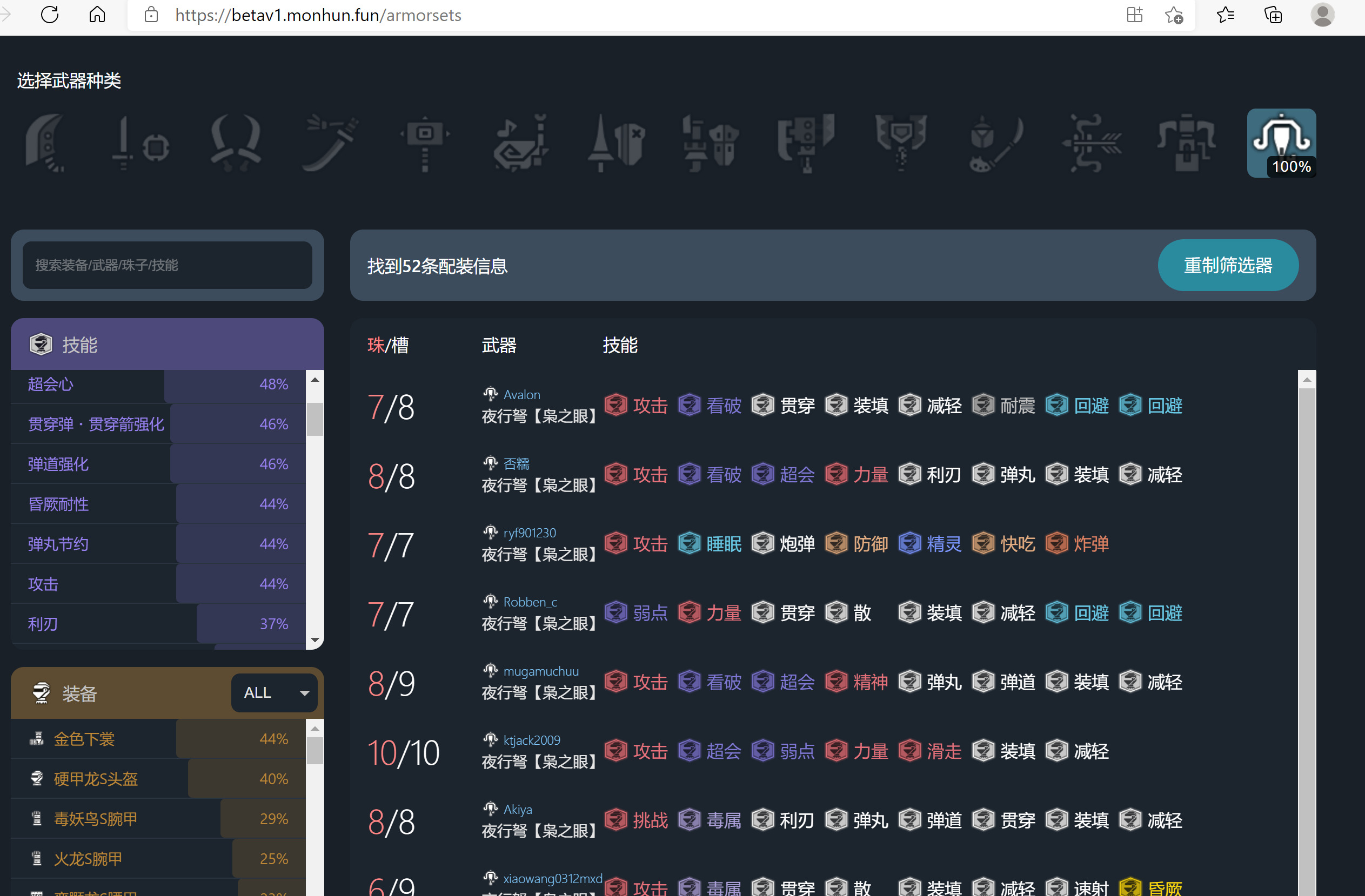 除此之外,在“配装”界面,您可以欣赏到各位猎人配出的装备,浏览大家所使用的武器、护石、套装、技能的占比。通过左上角的关键词输入,能对大家的配装方案进行自定义筛选。