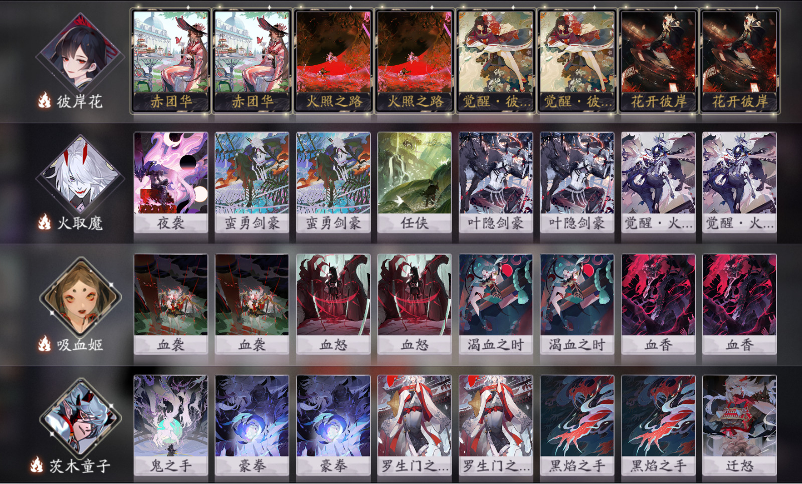 阵容名: 吸血姬 渴血之时 (2) 血香 (2) 血袭 (2) 血怒 (2) 彼岸花 赤团华 (2) 花开彼岸 (2) 火照之路 (2) 觉醒·彼岸花 (2) 火取魔 夜袭 (1) 蛮勇剑豪 (2) 任侠 (1) 叶隐剑豪 (2) 觉醒·火取魔 (2) 茨木童子 迁怒 (1) 罗生门之鬼 (2) 黑焰之手 (2) 鬼之手 (1) 豪拳 (2) 阵容码:Ml8xMDFfNTYxODU1NF8xNjE3MjUxOTYyfHp4AAACAAAAqgkBAK4JAQC2CQEAugkBAMU+AQDKPgEAzT4BANY+AQDaPgEAZg4BAGoOAQBWDgEAXg4BAIGtAACSrQAAdq0AAHmtAAB+rQAA 异画:engAAGnxGQA= 如果想要使用此阵容,可将阵容码复制到剪贴板,然后在“新建阵容”里点击“使用阵容码”进行粘贴。