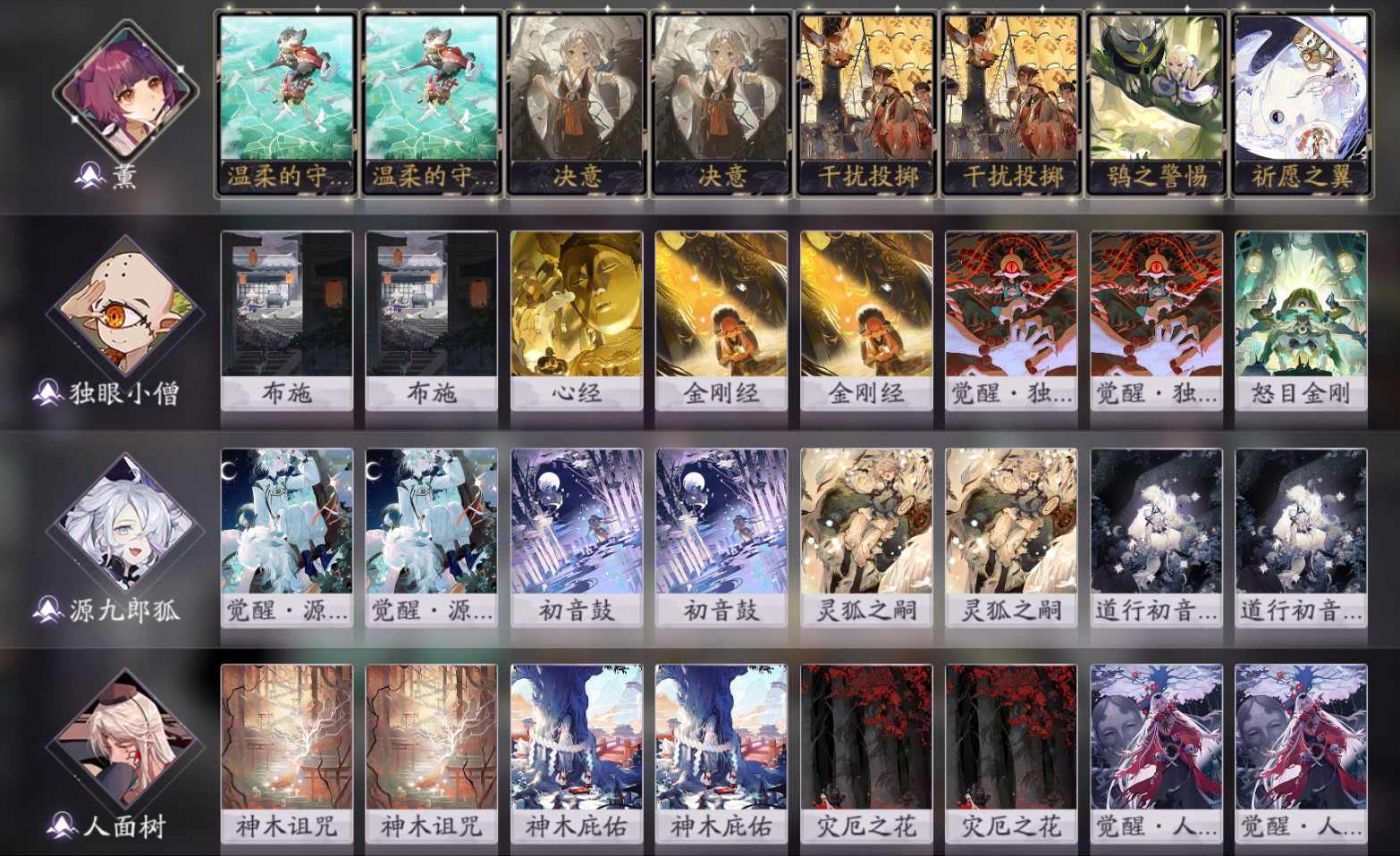 阵容名: 源九郎狐 初音鼓 (2) 灵狐之嗣 (2) 道行初音旅 (2) 觉醒·源九郎狐 (2) 独眼小僧 怒目金刚 (1) 布施 (2) 心经 (1) 金刚经 (2) 觉醒·独眼小僧 (2) 薰 温柔的守护 (2) 决意 (2) 干扰投掷 (2) 鸮之警惕 (1) 祈愿之翼 (1) 人面树 神木庇佑 (2) 灾厄之花 (2) 觉醒·人面树 (2) 神木诅咒 (2) 阵容码:Ml8xMDFfNTYxODU1NF8xNjE3MjUxMzMyfHp4AAACAAAAqiIBAK4iAQCyIgEAtSIBAL0iAQDhJQEAxiUBAMklAQDSJQEA1iUBAGZAAQByQAEAdkABAF5AAQDiGgEA5hoBAPIaAQDaGgEA 如果想要使用此阵容,可将阵容码复制到剪贴板,然后在“新建阵容”里点击“使用阵容码”进行粘贴。