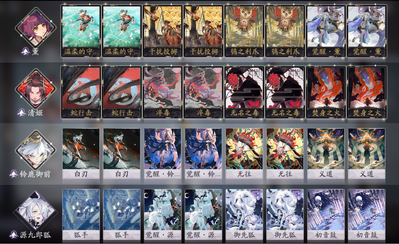 阵容名: 清姬 无名之毒 (2) 焚身之火 (2) 蛇行击 (2) 淬毒 (2) 铃鹿御前 义道 (2) 白刃 (2) 觉醒·铃鹿御前 (2) 无往 (2) 源九郎狐 御先狐 (2) 初音鼓 (2) 狐手 (2) 觉醒·源九郎狐 (2) 薰 鸮之利爪 (2) 温柔的守护 (2) 干扰投掷 (2) 觉醒·薰 (2) 阵容码:Ml8xMDFfNTYxODU1NF8xNjE3MjUxMTAxfHp4AAACAAAApiIBAKoiAQCyIgEAuiIBAMKzAADGswAAtrMAALqzAABiGQEARhkBAFYZAQBaGQEAYkABAGZAAQBWQAEAXkABAA== 异画:engAADV5GwA= 如果想要使用此阵容,可将阵容码复制到剪贴板,然后在“新建阵容”里点击“使用阵容码”进行粘贴。