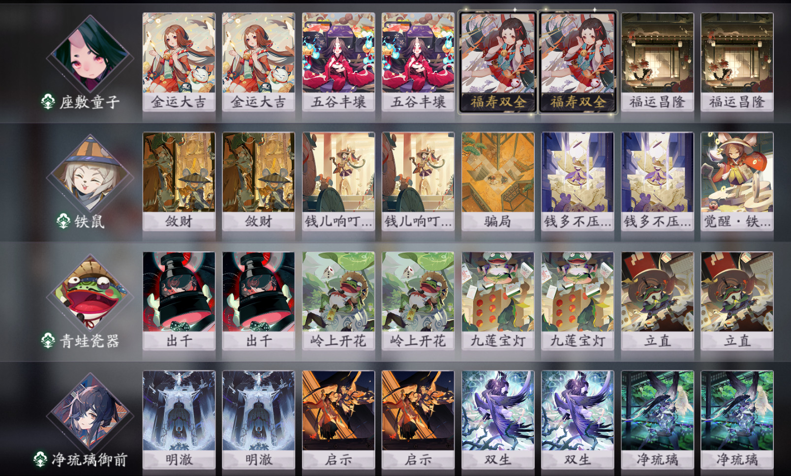 阵容名: 铁鼠 觉醒·铁鼠 (1) 敛财 (2) 钱儿响叮当 (2) 骗局 (1) 钱多不压身 (2) 青蛙瓷器 九莲宝灯 (2) 出千 (2) 岭上开花 (2) 立直 (2) 净琉璃御前 净琉璃 (2) 明澈 (2) 启示 (2) 双生 (2) 座敷童子 金运大吉 (2) 五谷丰壤 (2) 福运昌隆 (2) 福寿双全 (2) 阵容码:Ml8xMDFfNTYxODU1NF8xNjE3MjUxNjY1fHp4AAACAAAAJssAACrLAAAyywAAPssAAGFLAQBGSwEATksBAFVLAQBaSwEAAsUAAObEAADuxAAABsUAAAJCAQDqQQEA7kEBAPZBAQA= 如果想要使用此阵容,可将阵容码复制到剪贴板,然后在“新建阵容”里点击“使用阵容码”进行粘贴。