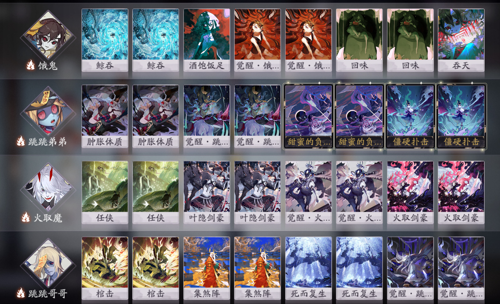 阵容名: 饿鬼 鲸吞 (2) 酒饱饭足 (1) 回味 (2) 吞天 (1) 觉醒·饿鬼 (2) 跳跳哥哥 死而复生 (2) 觉醒·跳跳哥哥 (2) 棺击 (2) 集煞阵 (2) 跳跳弟弟 觉醒·跳跳弟弟 (2) 甜蜜的负担 (2) 肿胀体质 (2) 僵硬扑击 (2) 火取魔 火取剑豪 (2) 任侠 (2) 叶隐剑豪 (2) 觉醒·火取魔 (2) 阵容码:Ml8xMDFfNTYxODU1NF8xNjE3MjUxNDAwfHp4AAACAAAAIlMBACVTAQAqUwEALVMBADJTAQBCsgAARrIAADKyAAA6sgAA4j4BAM4+AQDWPgEA2j4BAAIeAQASHgEA9h0BAPodAQA= 如果想要使用此阵容,可将阵容码复制到剪贴板,然后在“新建阵容”里点击“使用阵容码”进行粘贴。