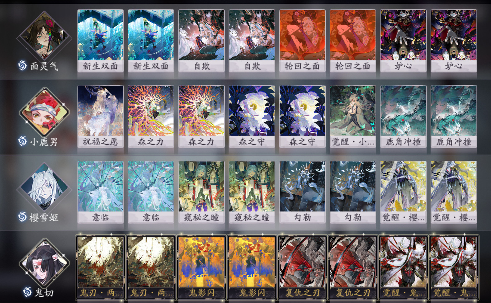 阵容名: 樱雪姬 觉醒·樱雪姬 (2) 意临 (2) 窥秘之瞳 (2) 勾勒 (2) 面灵气 妒心 (2) 新生双面 (2) 自欺 (2) 轮回之面 (2) 小鹿男 森之守 (2) 鹿角冲撞 (2) 觉醒·小鹿男 (1) 祝福之愿 (1) 森之力 (2) 鬼切 复仇之刃 (2) 觉醒·鬼切 (2) 鬼刃·两断 (2) 鬼影闪 (2) 阵容码:Ml8xMDFfNTYxODU1NF8xNjE3MjUxMjY2fHp4AAACAAAAIkUBAAZFAQASRQEAGkUBAMb+AADK/gAA0f4AALX+AAC+/gAAikMBAHZDAQB6QwEAfkMBAIoqAQCOKgEAdioBAHoqAQA= 异画:engAAFm/HwA= 如果想要使用此阵容,可将阵容码复制到剪贴板,然后在“新建阵容”里点击“使用阵容码”进行粘贴。