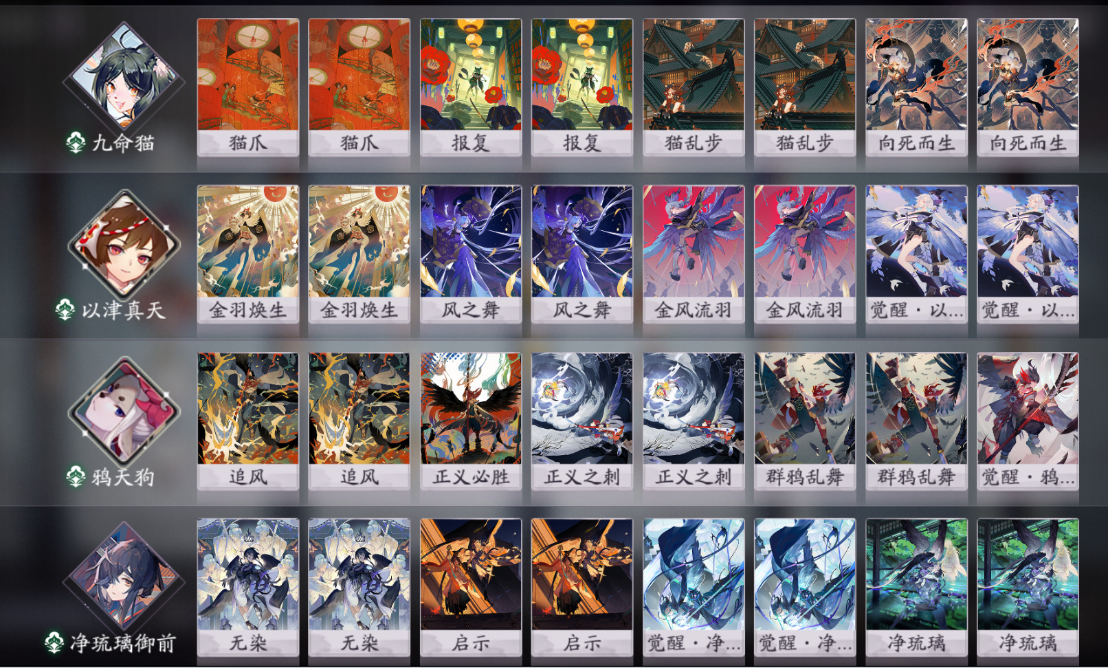 阵容名: 以津真天 觉醒·以津真天 (2) 风之舞 (2) 金羽焕生 (2) 金风流羽 (2) 鸦天狗 群鸦乱舞 (2) 正义必胜 (1) 觉醒·鸦天狗 (1) 追风 (2) 正义之刺 (2) 九命猫 报复 (2) 猫乱步 (2) 向死而生 (2) 猫爪 (2) 净琉璃御前 净琉璃 (2) 无染 (2) 启示 (2) 觉醒·净琉璃御前 (2) 阵容码:Ml8xMDFfNTYxODU1NF8xNjE3MjUxMjAzfHp4AAACAAAAJjoBACo6AQAuOgEAFjoBAFLAAABWwAAAOsAAAD7AAABC2QAASdkAAFHZAAA22QAAOtkAAAJCAQDmQQEA7kEBAPpBAQA= 如果想要使用此阵容,可将阵容码复制到剪贴板,然后在“新建阵容”里点击“使用阵容码”进行粘贴。