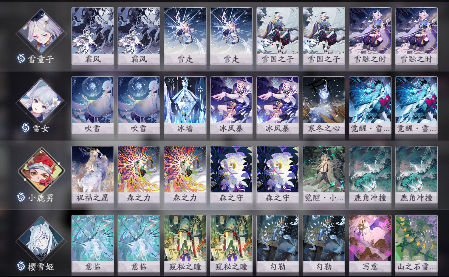阵容名: 樱雪姬 写意 (1) 山之石雪之雫 (1) 意临 (2) 窥秘之瞳 (2) 勾勒 (2) 雪女 冰墙 (1) 寒冬之心 (1) 冰风暴 (2) 吹雪 (2) 觉醒·雪女 (2) 小鹿男 森之守 (2) 鹿角冲撞 (2) 觉醒·小鹿男 (1) 祝福之愿 (1) 森之力 (2) 雪童子 雪走 (2) 雪国之子 (2) 雪融之时 (2) 霜风 (2) 阵容码:Ml8xMDFfNTYxODU1NF8xNjE3MjUxNDg2fHp4AAACAAAABq8AAA6vAAAarwAAHq8AAMWlAADJpQAAsqUAALalAAC6pQAAxv4AAMr+AADR/gAAtf4AAL7+AACNQwEAkUMBAHZDAQB6QwEAfkMBAA== 异画:engAAC0YEQA= 如果想要使用此阵容,可将阵容码复制到剪贴板,然后在“新建阵容”里点击“使用阵容码”进行粘贴。