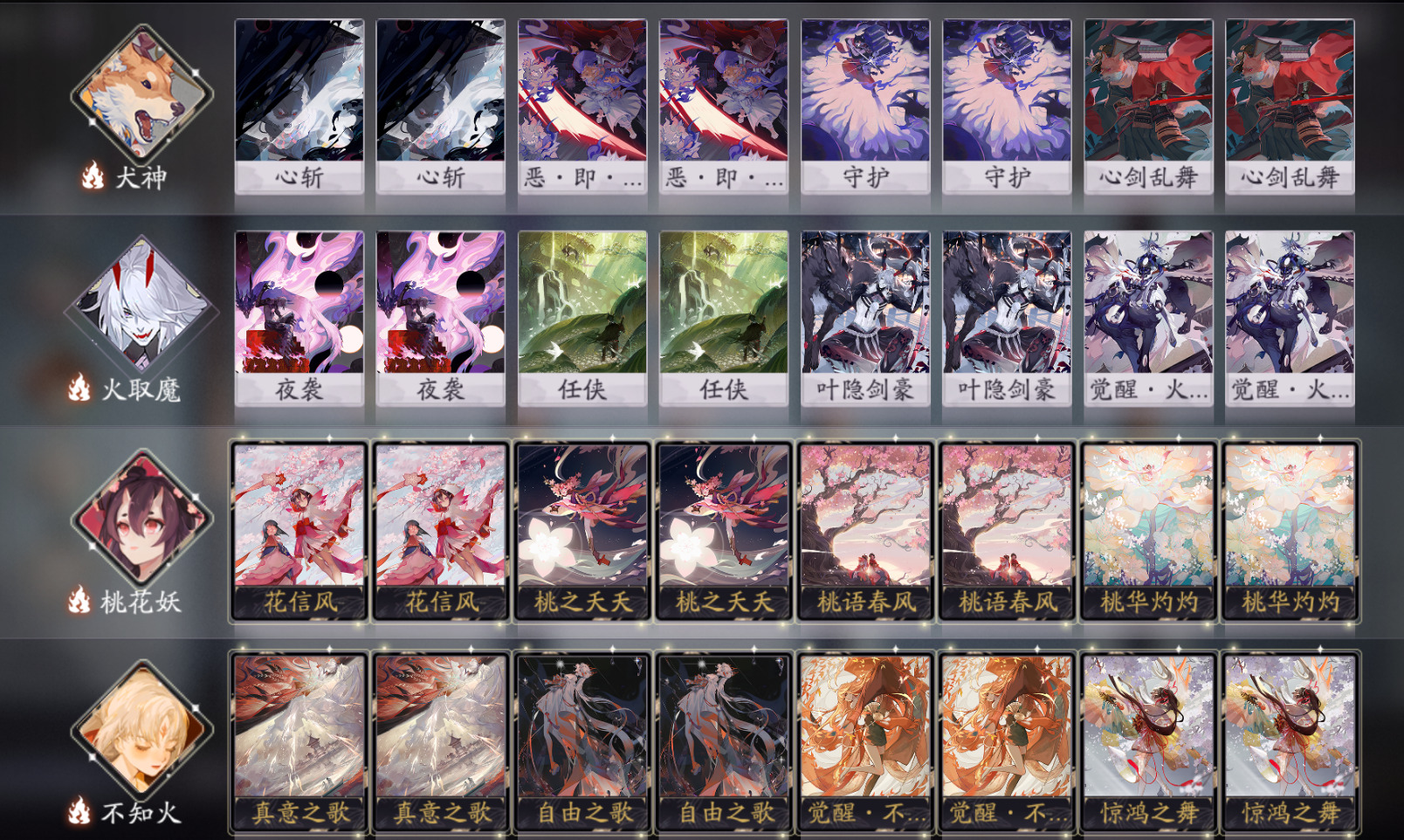 阵容名: 不知火 惊鸿之舞 (2) 觉醒·不知火 (2) 自由之歌 (2) 真意之歌 (2) 火取魔 夜袭 (2) 任侠 (2) 叶隐剑豪 (2) 觉醒·火取魔 (2) 犬神 恶·即·斩 (2) 心剑乱舞 (2) 守护 (2) 心斩 (2) 桃花妖 桃语春风 (2) 花信风 (2) 桃之夭夭 (2) 桃华灼灼 (2) 阵容码:Ml8xMDFfNTYxODU1NF8xNjE3MjUxMTAxfHp4AAACAAAAIr0AACa9AAA2vQAAGr0AAMY+AQDOPgEA1j4BANo+AQDiqAAAyqgAAM6oAADeqAAADgUBABIFAQD6BAEA/gQBAA== 如果想要使用此阵容,可将阵容码复制到剪贴板,然后在“新建阵容”里点击“使用阵容码”进行粘贴。