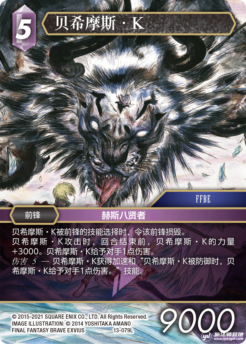 【13-079L】贝希摩斯·K是消耗为5、【种类(FFBE)】、力量9000的雷属性前锋,职业是赫斯八贤者。拥有技能“贝希摩斯·K被前锋的技能选择时,令该前锋损毁。”和“贝希摩斯·K攻击时,回合结束前,贝希摩斯·K的力量+3000。贝希摩斯·K给予对手1点伤害。”。此外,如果你受到5点或以上伤害,还会获得“贝希摩斯·K获得加速和‘贝希摩斯·K被防御时,贝希摩斯·K给予对手1点伤害。’技能。”。