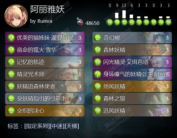 宿命的狐火·雪华是这套牌的主要制胜手段。她能在后期作为2费7/7疾驰甚至3费11/11疾驰登场,配合阿丽雅、优美的猫姊妹·暹罗与暹玛、闪光精灵·艾珥芭塔打出高额斩杀。
