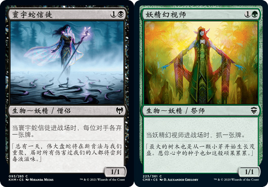 这两者的不同之处就是妖精幻视师会导向大规模对局而寰宇蛇信徒导向小规模对局。如果你经常在妖精套牌中使用妖精幻视师,并且会带很多妖精头子和横行,你可能会想“这个妖精真不错,而且我还有很多膨胀咒语,所以不太关心它的基础身材”,同时你可能觉得寰宇蛇信徒在这套牌中也差不多。