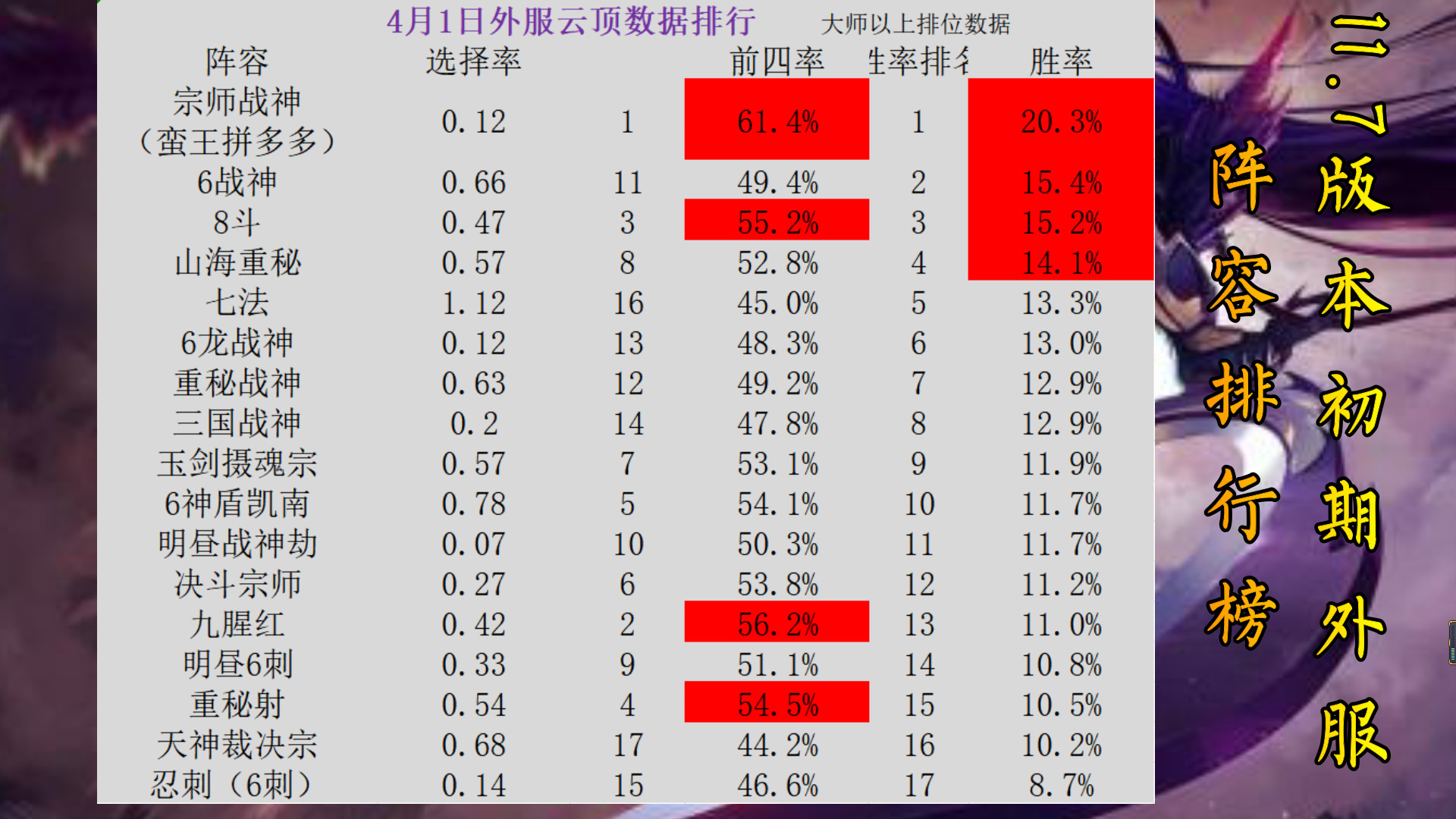 由于国服排行数据还未出,外服比国服早开,摩昂就把外服强势阵容进行统计,但国服与外服环境上还是存在着差异,仅供大家参考。