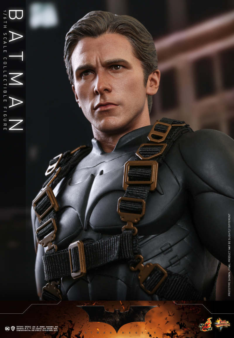 本作高约32 公分,全身共计30 处可动,Hot Toys 根据电影设定以高弹性橡胶材质制作整套蝙蝠战衣,斗篷则是以磁吸式功能安置在肩膀处,头雕部分共有蝙蝠面罩与裸颜两款,面罩头雕还可藉由换脸技术替换三款下半脸零件,展现出不同的情绪状态,裸颜头雕则出色地形塑出演员「克里斯汀·贝尔(Christian Bale)」的面部轮廓和肤质纹理,再加上背带、黑色头套(Balaclava),就能还原《开战时刻》中的两种造型。