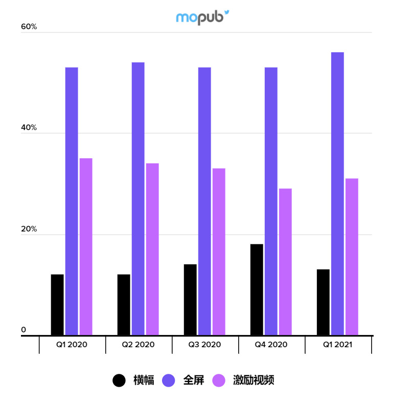 尽管广告行业整体需求疲软,但在 2020 年,广告仍然是移动游戏变现的重要途径。移动广告在 2020 年推动了整个广告行业的发展,而游戏是其中的主要贡献者。在MoPub 的交易平台中,插屏和激励视频广告带来了 80% 的游戏收入。