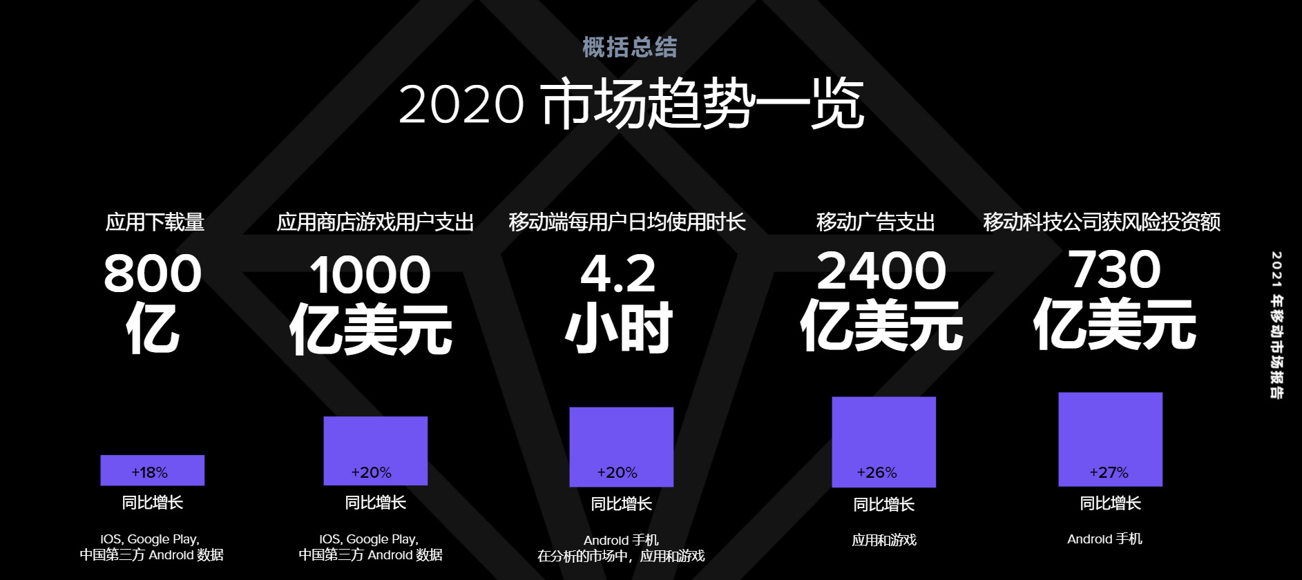 数据显示,游戏在移动应用业务中占据主导地位,尤其是在收入方面。2020 年,应用用户支出为 1430 亿美元,其中有 1000 亿美元花在游戏上,占比达十分之七。在下载量方面,2020 年,用户下载的移动应用中有 36% 是游戏,在 2180 亿次下载量中占 800 亿次。其增速比各类应用整体下载量增长高出 2.5 倍。2020 年,用户在移动游戏上花费的时间为 2960 亿小时,与 2019 年的 2220 亿小时相比增加了 35%。