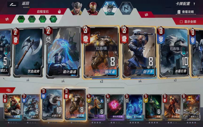 11、记住,本卡组不做任何多余的操作,尽量不要花任何宝石在除了关键牌之外的卡牌上,像以前很多同学会复制霍华德鸭子、红浩克、绿宝宝,本卡组的核心卡牌很容易找,这种情况下,一定要把宝石全部花给宗师、洛基、群杀。