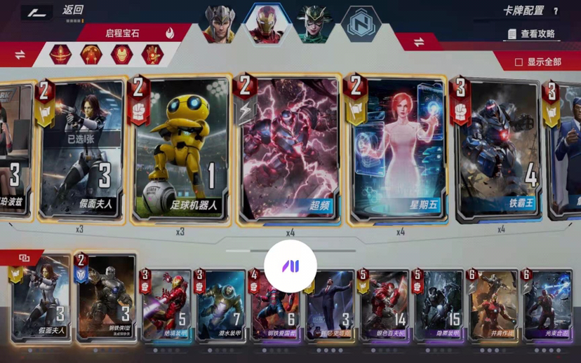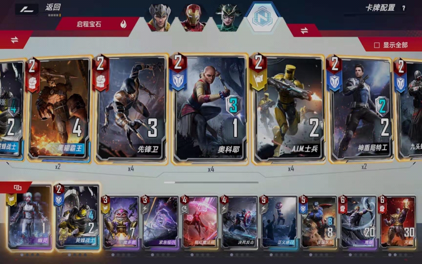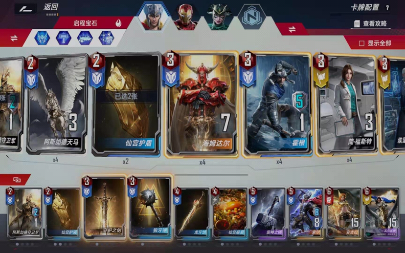 2、前三回合老打法,拿最强战力,第四回合直接速五本,本卡组有即时战力最强的钢铁侠和海拉,所以前三回合非常强力,这给第四回合速五打好了良好的基础,第四回合速五之后找托尼老师、宗师、工具人加盾、洛基。