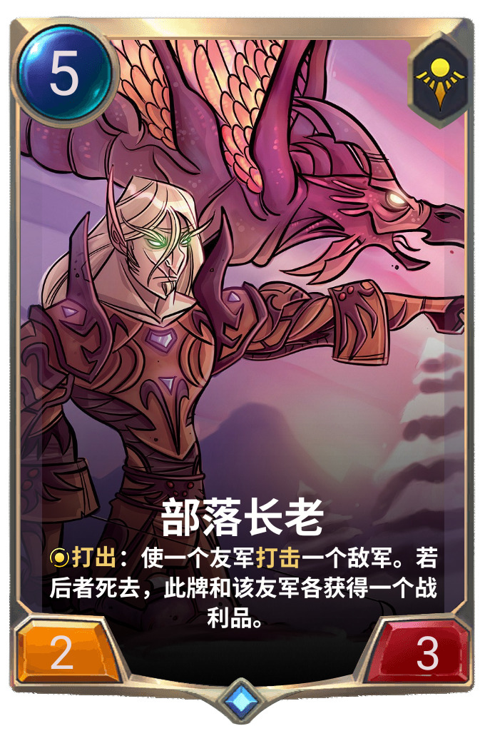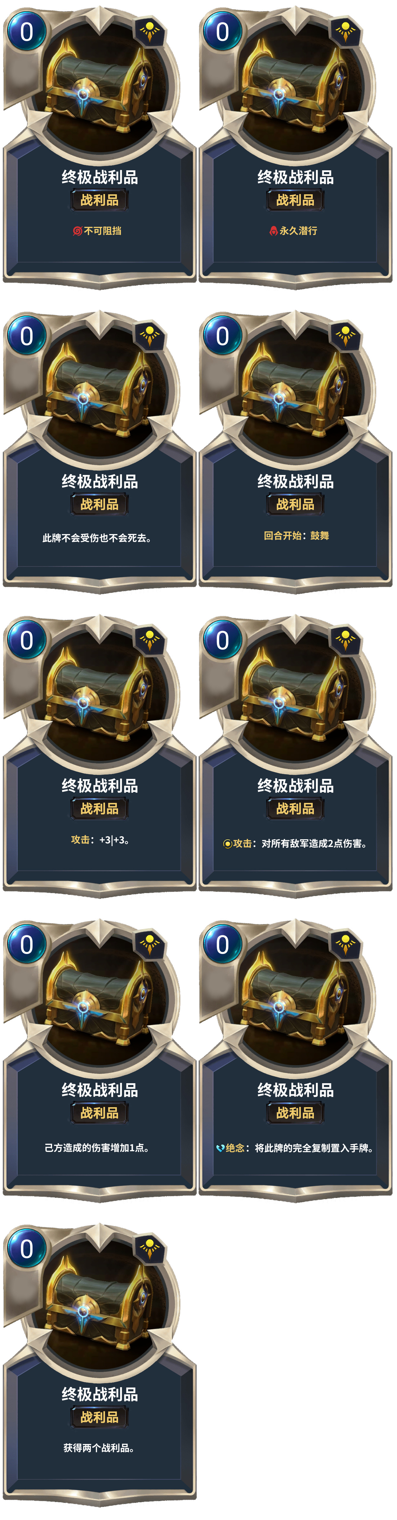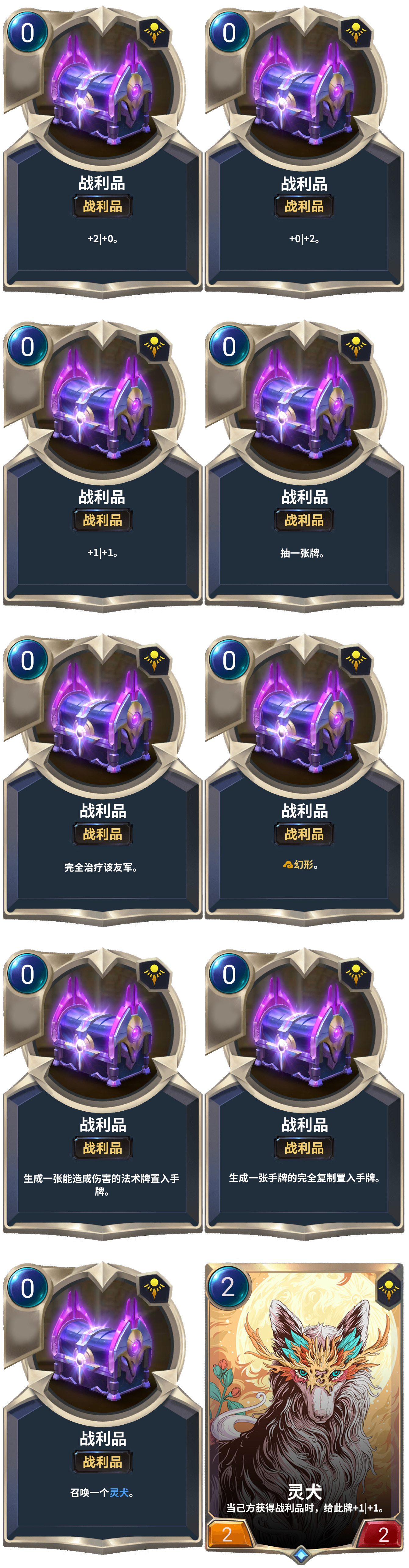 注:获得战利品时,从三个战利品效果中选取一个触发。若手牌中友军获得战利品,则在召唤此牌时才触发战利品的效果。