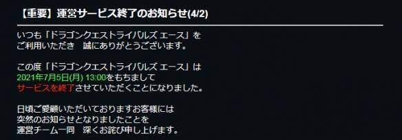 SQUARE ENIX宣布旗下iOS/Android/Switch/PC平台卡牌策略游戏《勇者斗恶龙宿敌Ace》将于7月5日北京时间12点正式停服。
