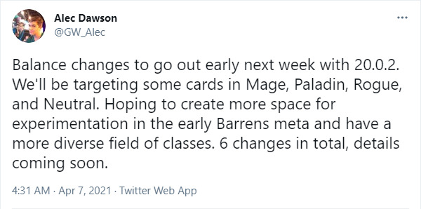 Alec还透露了这次改动将包含6张牌,这个数字算是不太保守的;他也透露了改动范围是法师、骑士、盗贼和中立,因此某些职业要被削不止一张了。Alec最后还表示“具体细节康明宋”,看来有希望在下周正式上线前就看到方案。