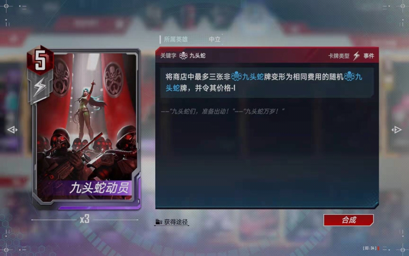 12、本卡组中立五费不用太固定,可以根据自己每天的对手情况进行调整,比如“九头蛇动员”,只在可能发张灭霸内战的时候使用这张卡牌,一般在商店五费卡牌多于两张的时候使用,以获得“突击神盾局”和九头蛇角色牌。在灭霸内战响指满天飞的时候能起到很好的效果。不习惯用突击神盾局或者灭霸内战比较少的时候可以把九头蛇动员改为一张“暗夜比邻星”。
