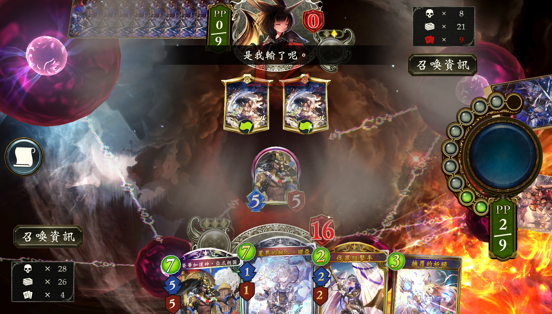 第7回合以后优先使用弗丽嘉,在后续回合使用荣华加护神·亚忒朗图。利用亚忒朗图和伐罪狙击手的直伤取胜。