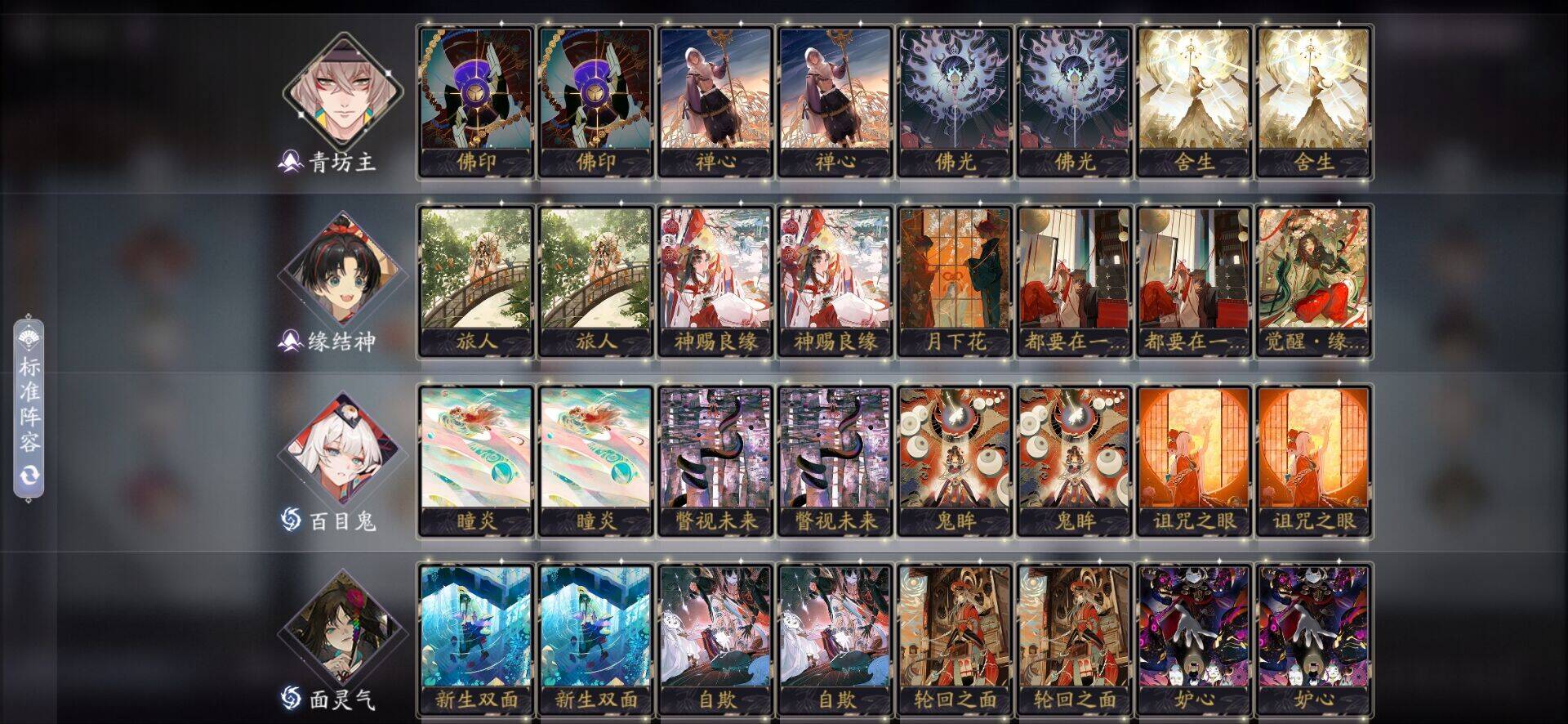 阵容名: 百目鬼 诅咒之眼 (2) 瞥视未来 (2) 瞳炎 (2) 鬼眸 (2) 缘结神 觉醒·缘结神 (1) 旅人 (2) 神赐良缘 (2) 月下花 (1) 都要在一起! (2) 青坊主 法界唯心 (1) 舍生 (2) 佛印 (1) 禅心 (2) 佛光 (2) 面灵气 妒心 (1) 新生双面 (2) 心生七面 (1) 自欺 (2) 轮回之面 (2) 阵容码:Ml8xMDFfNDg3NjUxNV8xNjE3ODg1Mzk4fHp4AAACAAAAoVEBAIZRAQCWUQEAmVEBAJ5RAQAhRQEABkUBAAlFAQASRQEAGkUBAGIyAQBGMgEASjIBAFoyAQBlwwAAbsMAAFXDAABawwAAXsMAAA== 异画:engAAD34IAA= 如果想要使用此阵容,可将阵容码复制到剪贴板,然后在“新建阵容”里点击“使用阵容码”进行粘贴。
