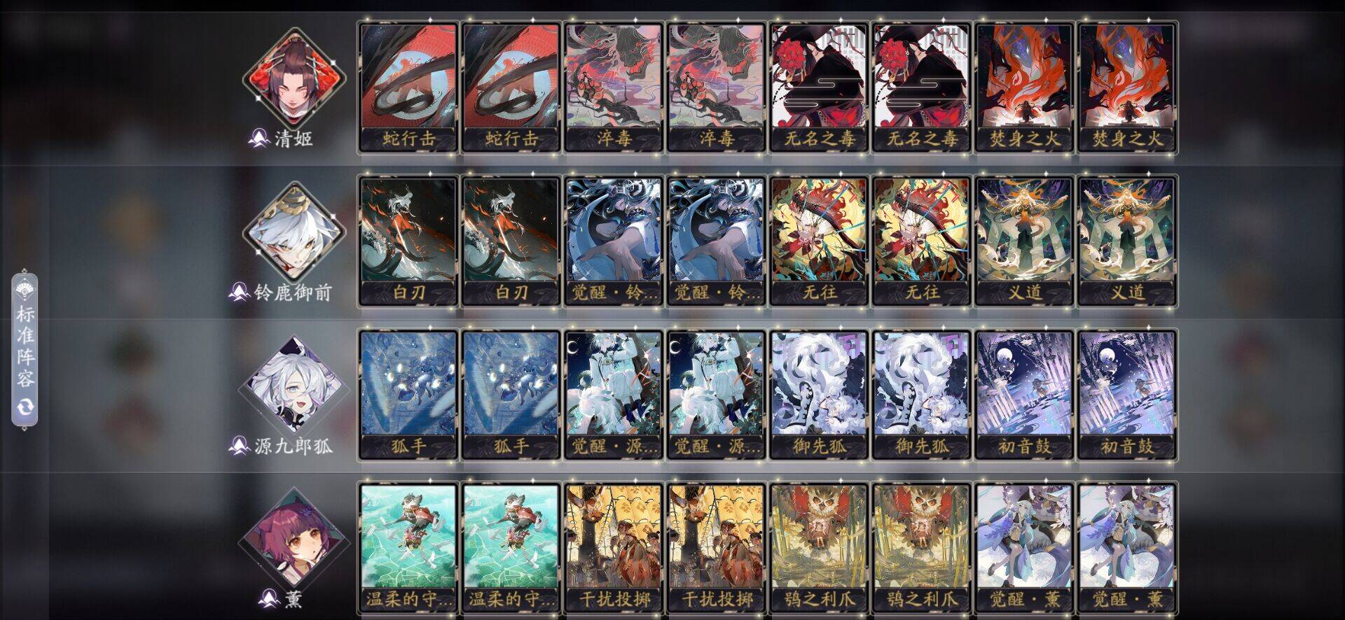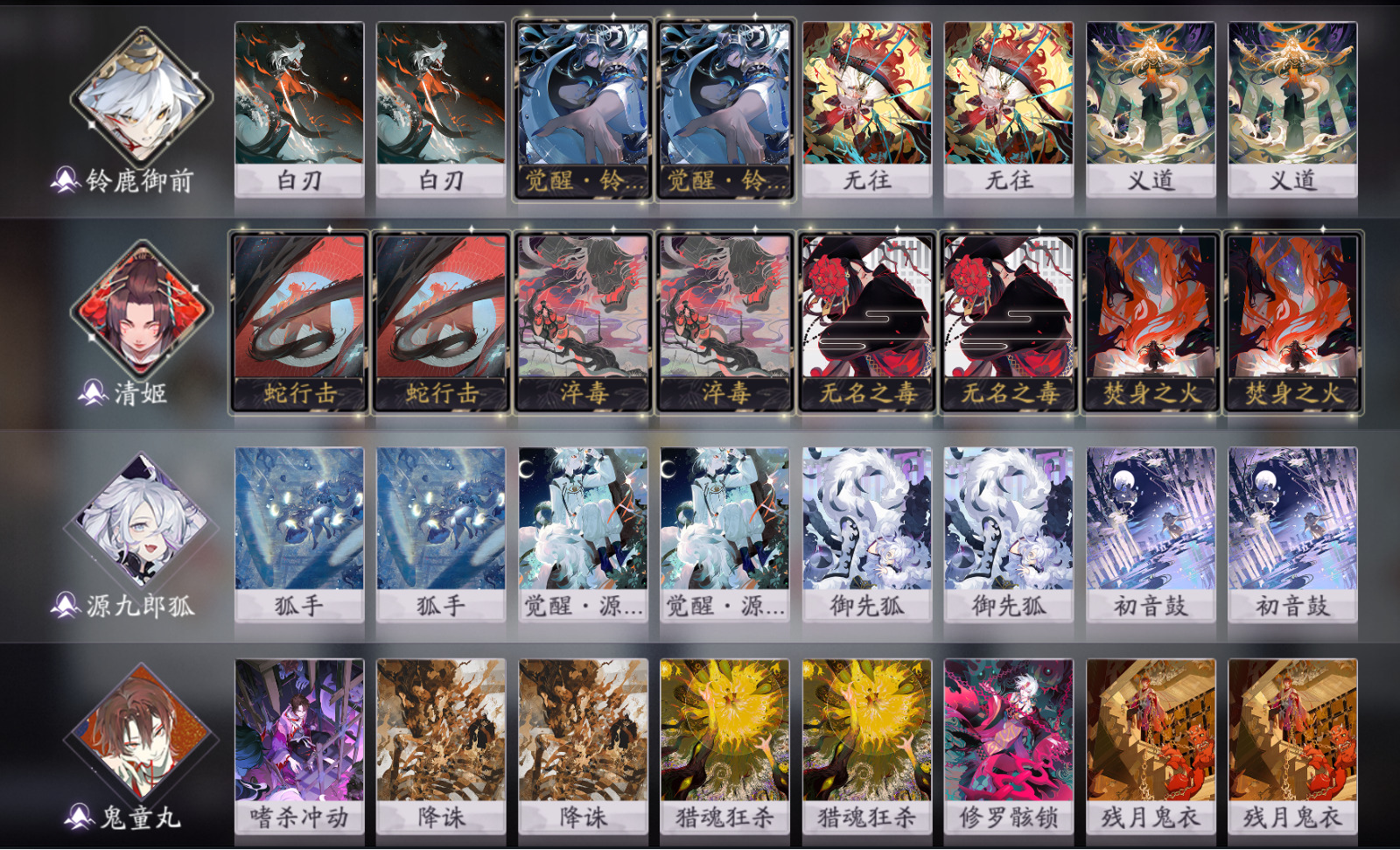 本次比赛采用卡组:“不知火、炭治郎、山童、火取魔”;“清姬、鬼童丸、源九郎狐、铃鹿御前”;“饿鬼、缘结神、青坊主、独眼小僧”