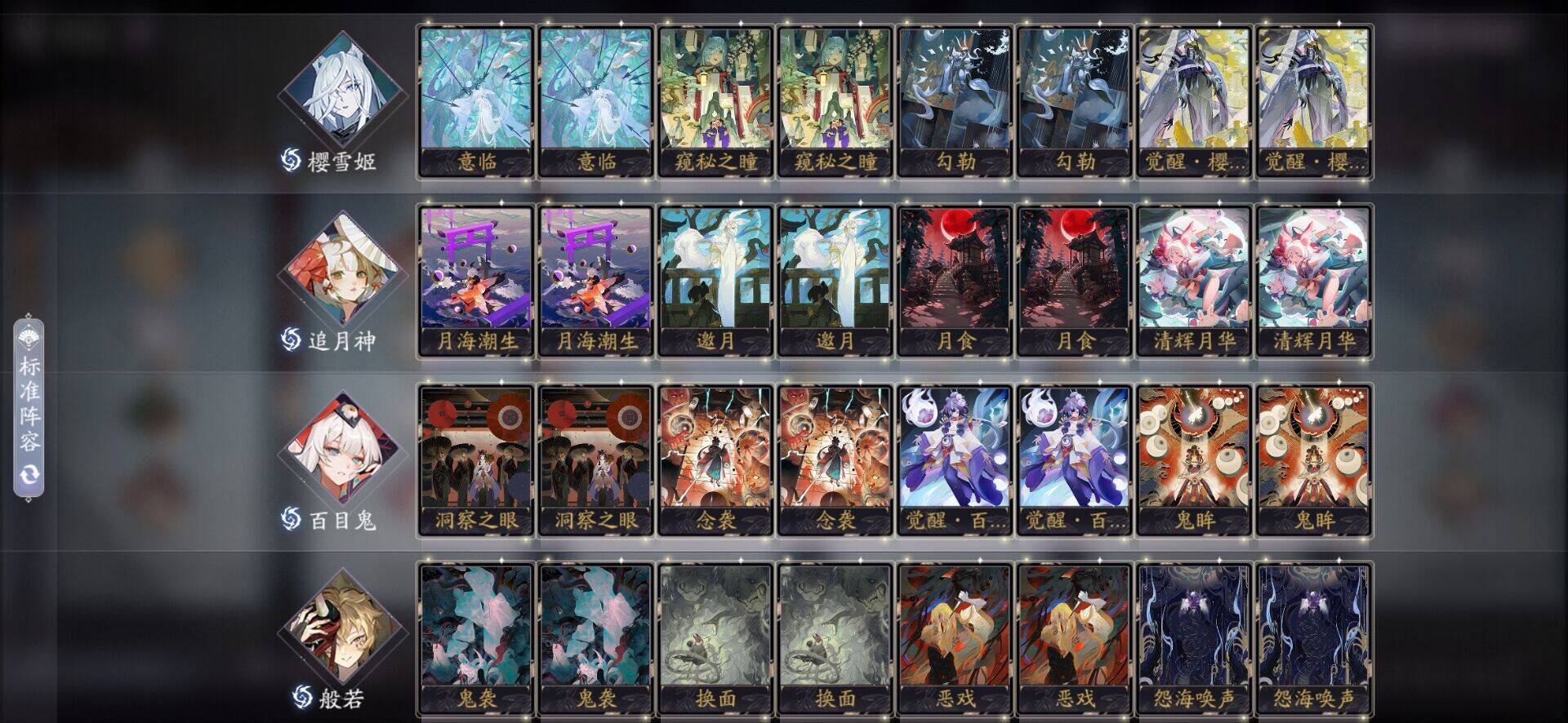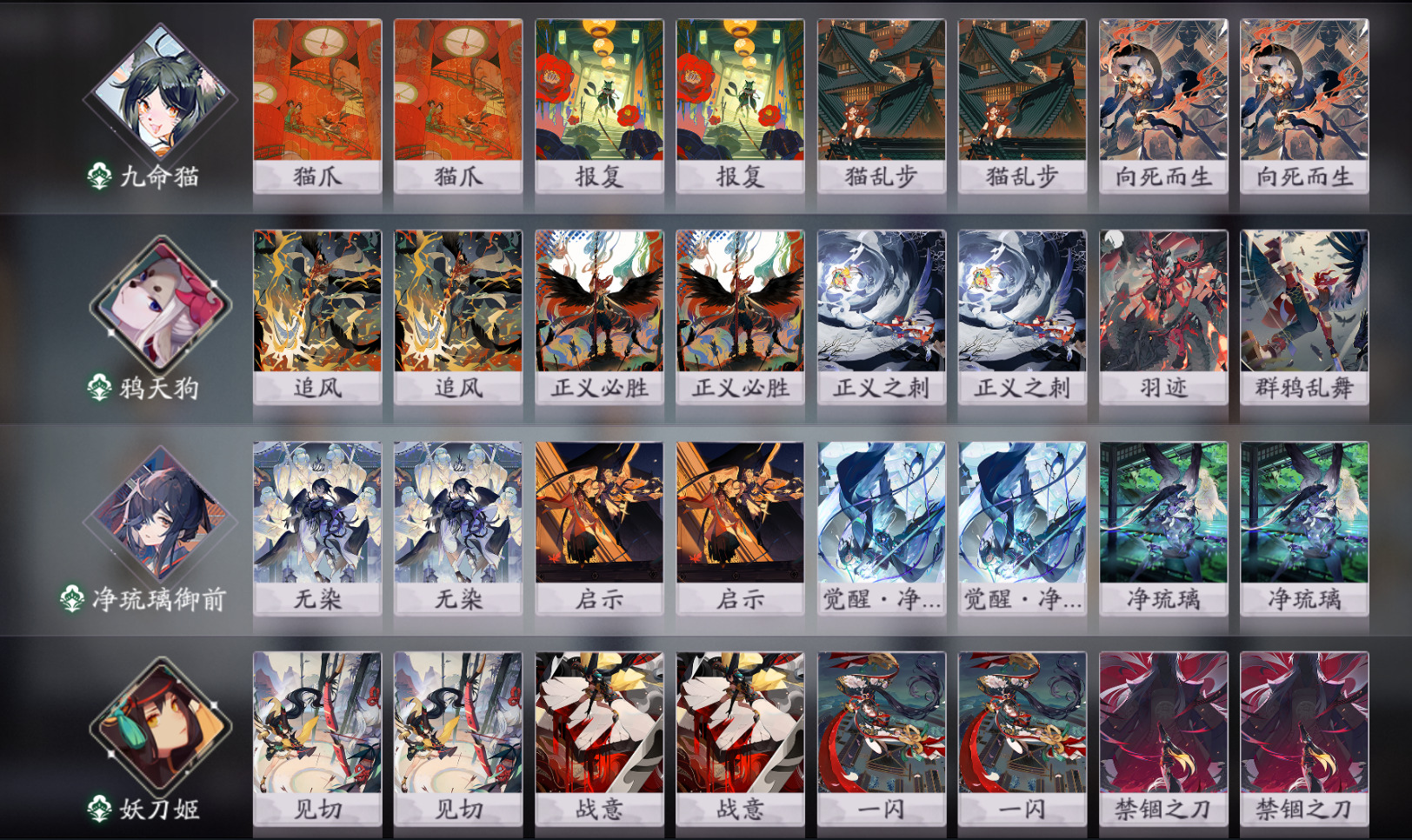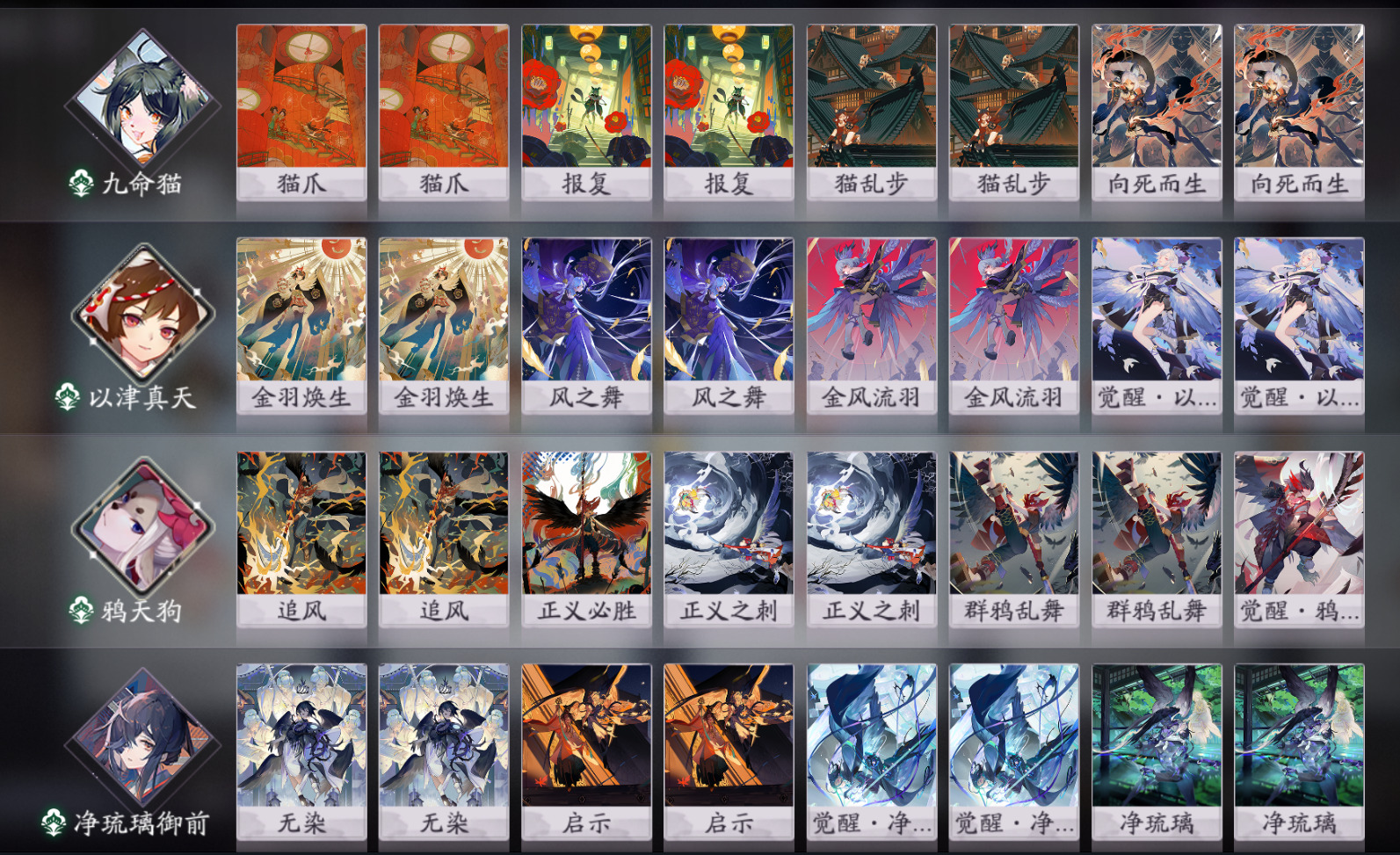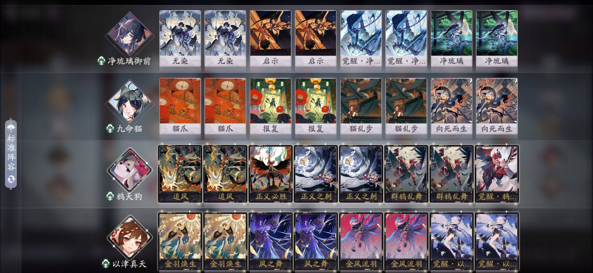 阵容名: 九命猫 报复 (2) 猫乱步 (2) 向死而生 (2) 猫爪 (2) 以津真天 觉醒·以津真天 (2) 风之舞 (2) 金羽焕生 (2) 金风流羽 (2) 鸦天狗 群鸦乱舞 (2) 正义必胜 (1) 觉醒·鸦天狗 (1) 追风 (2) 正义之刺 (2) 净琉璃御前 净琉璃 (2) 无染 (2) 启示 (2) 觉醒·净琉璃御前 (2) 阵容码:Ml8xMDFfNDg3NjUxNV8xNjE3ODg1Mzk4fHp4AAACAAAAJjoBACo6AQAuOgEAFjoBAFLAAABWwAAAOsAAAD7AAABC2QAASdkAAFHZAAA22QAAOtkAAAJCAQDmQQEA7kEBAPpBAQA= 如果想要使用此阵容,可将阵容码复制到剪贴板,然后在“新建阵容”里点击“使用阵容码”进行粘贴。