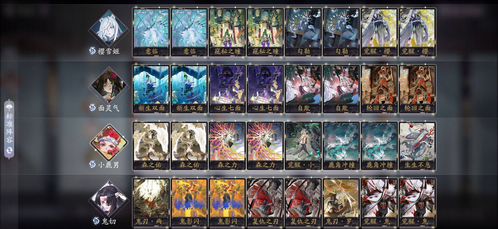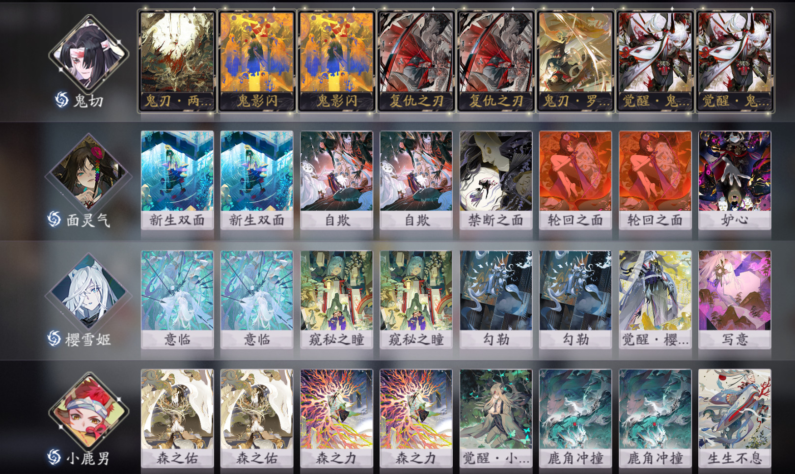 阵容名: 鬼切 鬼刃·罗城门 (1) 复仇之刃 (2) 觉醒·鬼切 (2) 鬼刃·两断 (1) 鬼影闪 (2) 面灵气 妒心 (1) 新生双面 (2) 自欺 (2) 禁断之面 (1) 轮回之面 (2) 樱雪姬 觉醒·樱雪姬 (1) 写意 (1) 意临 (2) 窥秘之瞳 (2) 勾勒 (2) 小鹿男 鹿角冲撞 (2) 生生不息 (1) 觉醒·小鹿男 (1) 森之佑 (2) 森之力 (2) 阵容码:Ml8xMDFfNDg3NjUxNV8xNjE3ODg1Mzk4fHp4AAACAAAAIUUBAAZFAQASRQEAFUUBABpFAQDK/gAAzf4AANH+AAC6/gAAvv4AAIlDAQCNQwEAdkMBAHpDAQB+QwEAhSoBAIoqAQCOKgEAdSoBAHoqAQA= 如果想要使用此阵容,可将阵容码复制到剪贴板,然后在“新建阵容”里点击“使用阵容码”进行粘贴。