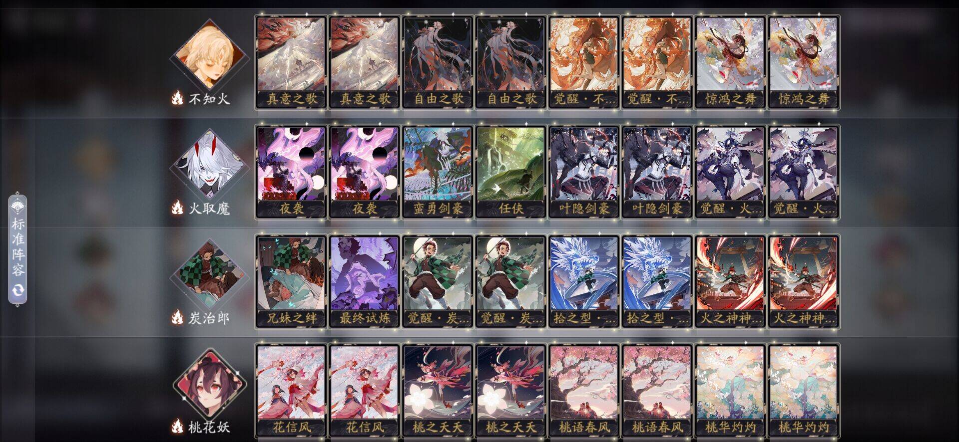 阵容名: 犬神 恶·即·斩 (2) 心剑乱舞 (2) 守护 (2) 心斩 (2) 火取魔 夜袭 (2) 任侠 (2) 叶隐剑豪 (2) 觉醒·火取魔 (2) 桃花妖 桃语春风 (2) 觉醒·桃花妖 (1) 花信风 (2) 桃之夭夭 (2) 桃华灼灼 (1) 不知火 惊鸿之舞 (2) 觉醒·不知火 (2) 自由之歌 (2) 真意之歌 (2) 阵容码:Ml8xMDFfNDg3NjUxNV8xNjE3ODg1Mzk4fHp4AAACAAAAIr0AACa9AAA2vQAAGr0AAMY+AQDOPgEA1j4BANo+AQDiqAAA5agAAMqoAADOqAAA3agAAA4FAQASBQEA+gQBAP4EAQA= 如果想要使用此阵容,可将阵容码复制到剪贴板,然后在“新建阵容”里点击“使用阵容码”进行粘贴。
