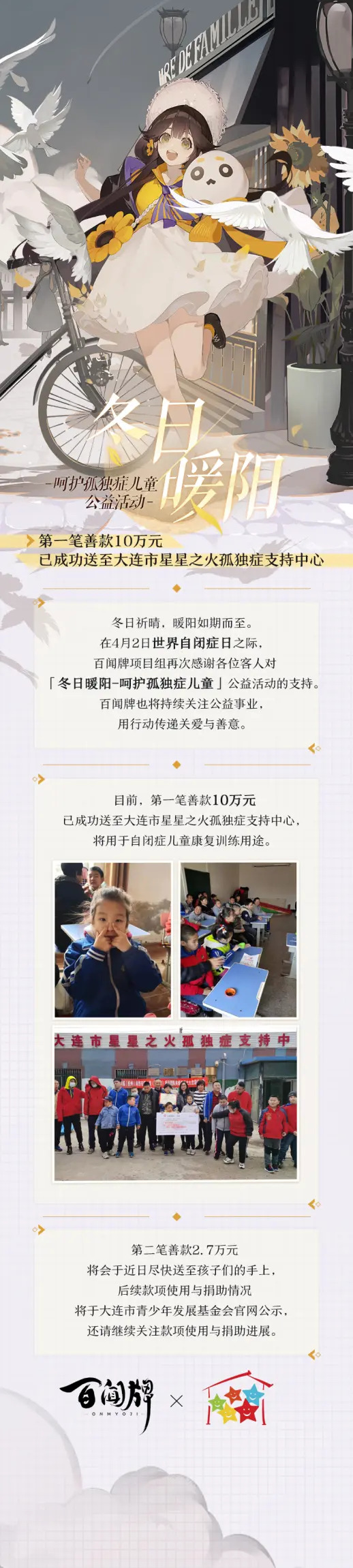 《阴阳师:百闻牌》× 大连市星星之火孤独症支持中心「冬日暖阳-呵护孤独症儿童」公益计划第一笔善款10万元已成功送至“星星的孩子们”手中,第二笔善款2.7万元也会尽快汇出,后续款项使用与捐助情况将在大连市青少年发展基金会官网公示。