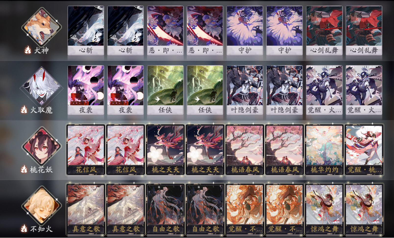 这套卡组主要用到了不知火的鼓舞,火取魔的夜袭以及两张形态带来的贯通。通过高鼓舞、高身材、瞬发出击和贯通的搭配,在二勾打出斩杀,是这套卡组的核心玩法。炭治郎可以换成犬神等其他优秀的红莲派系站场式神。