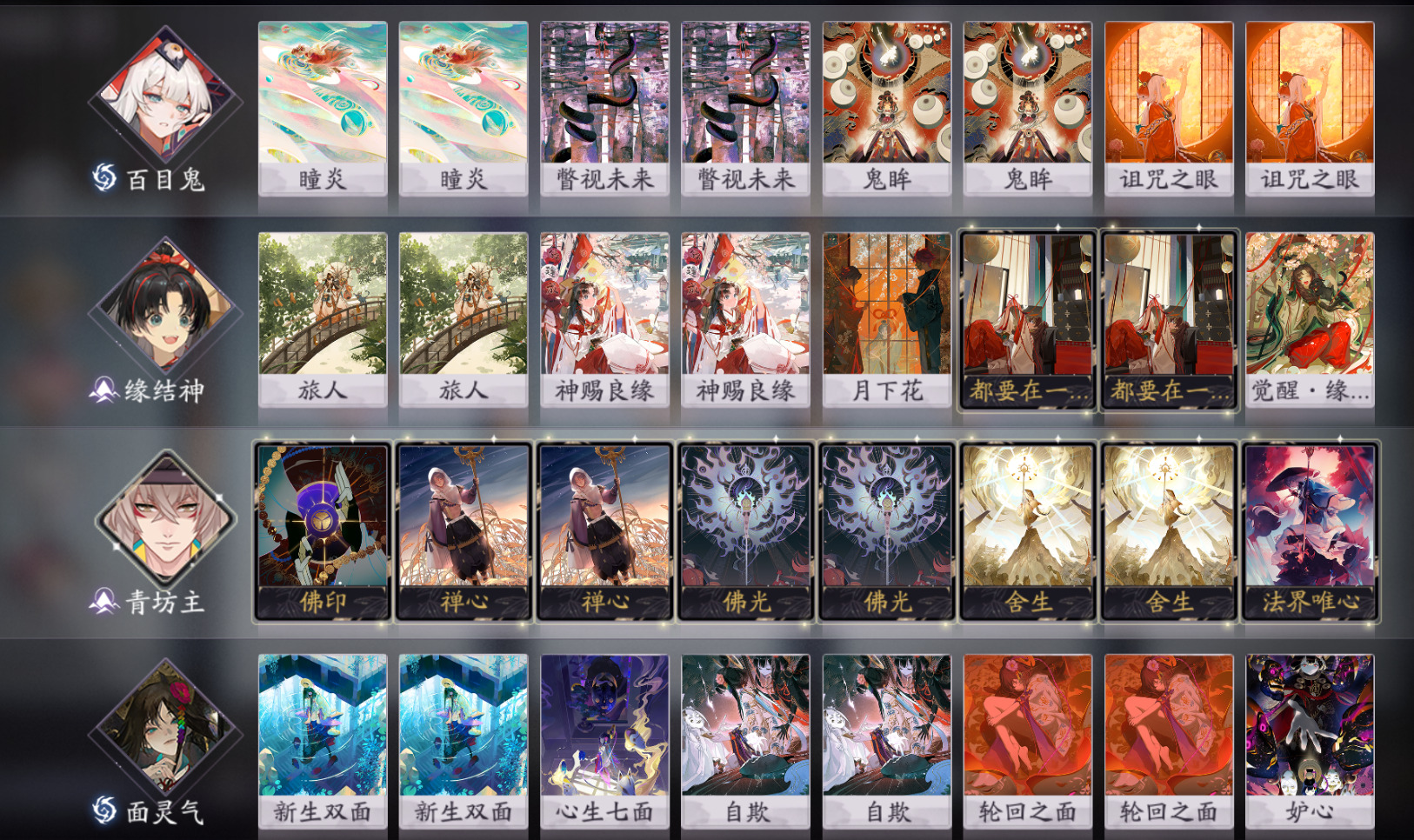 青缘目体系,对抗紫岩狐几乎9/1开的卡组。而且也是玩家们使用的较为熟练的体系。除了传统的搭配般若、黑白,目前较为流行的是搭配面灵气的版本,给卡组的解场、控场能力带来了更大的提升。