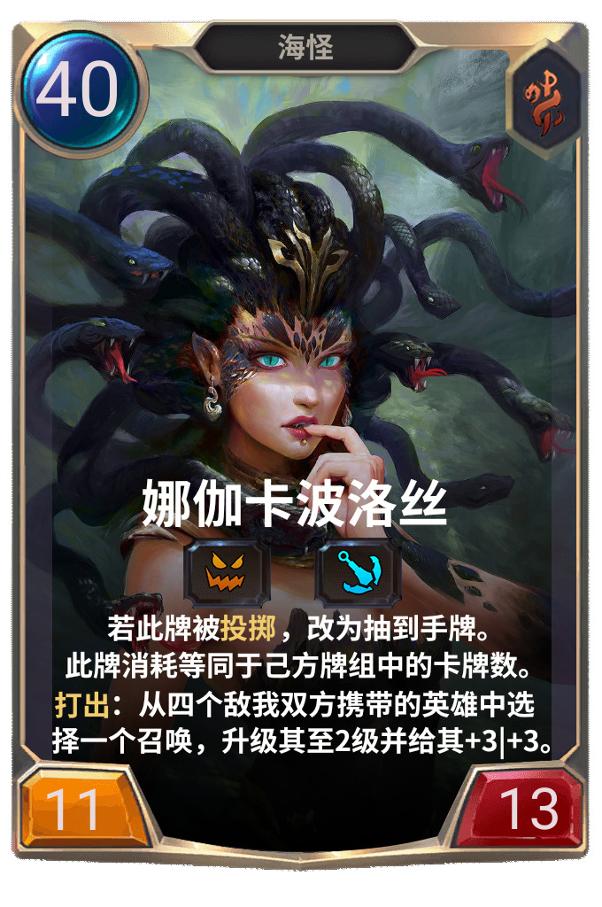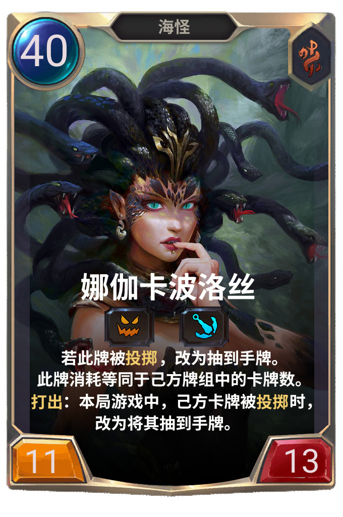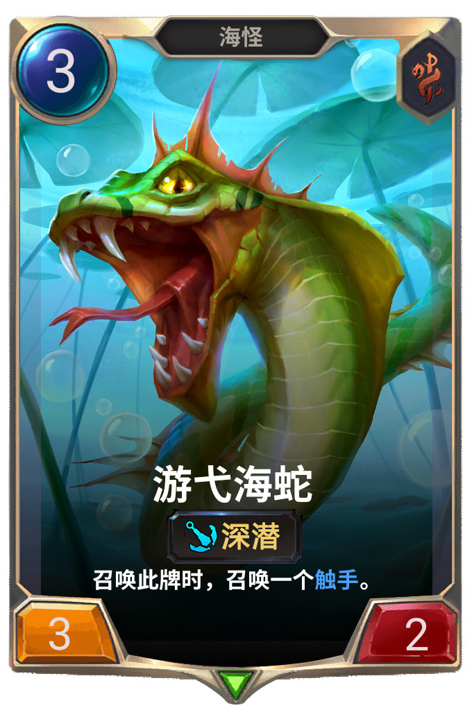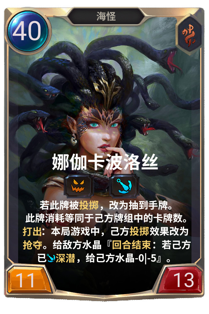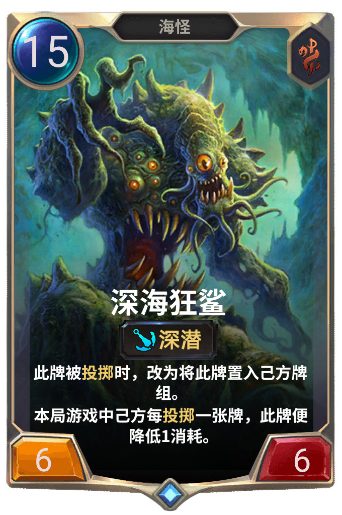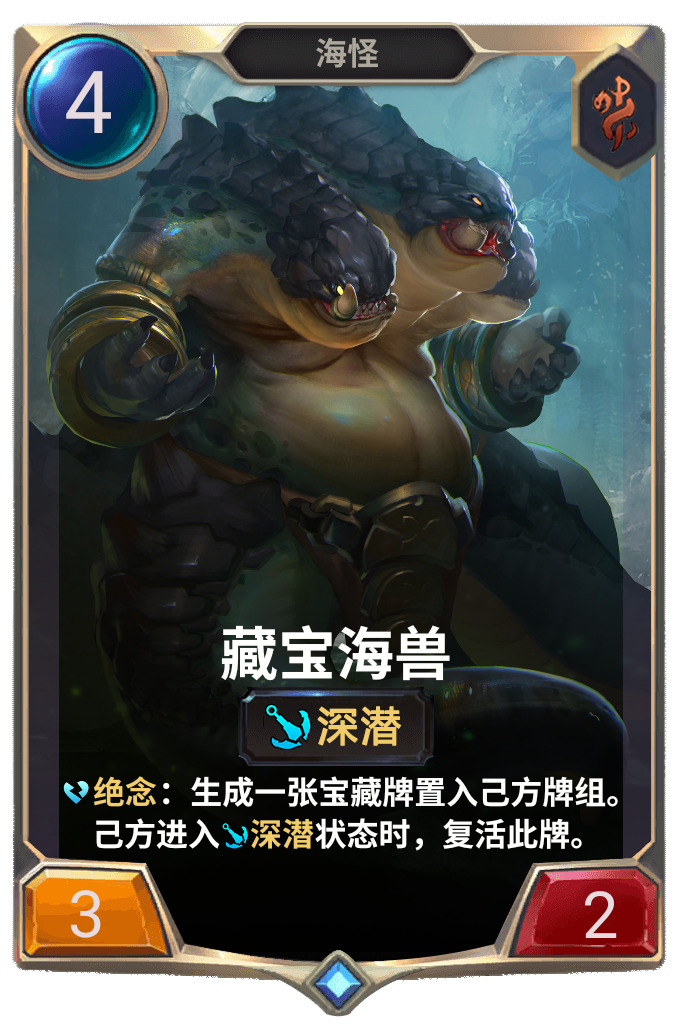 注:己方进入深潜状态指的是从未深潜状态转变为深潜状态的时候。此牌的宝藏牌和囤船海蛇的宝藏牌一样:无主珍宝、龙骨粉碎炮和海甲龙卵。