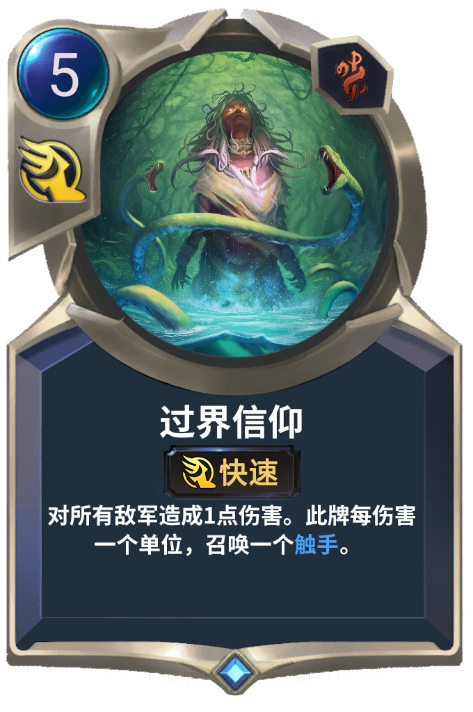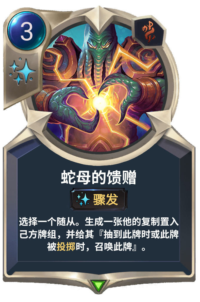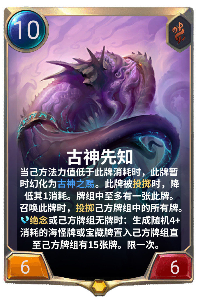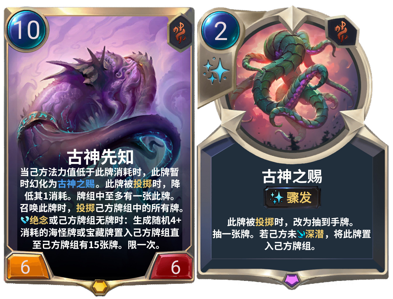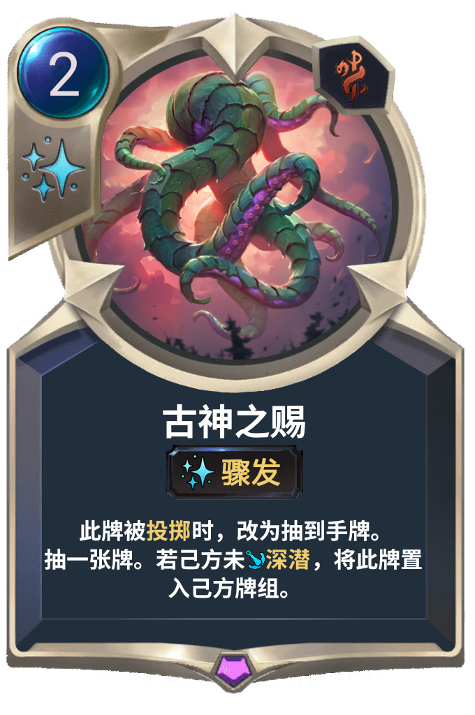 关于此牌的减费效果:此牌的暂时幻化效果在各处都会触发,包括牌组和手牌;此牌暂时幻化为古神之赐时被投掷亦会触发减费效果;此牌自带的减费效果并不会减少此牌暂时幻化为的古神之赐的费用,只会减少此单位牌的费用。