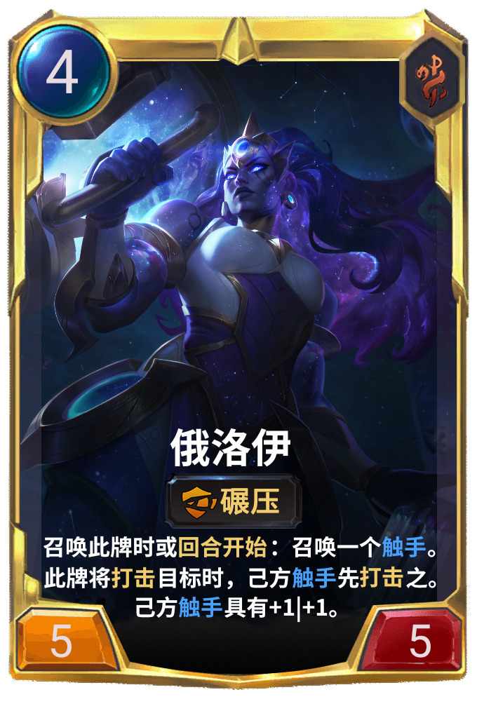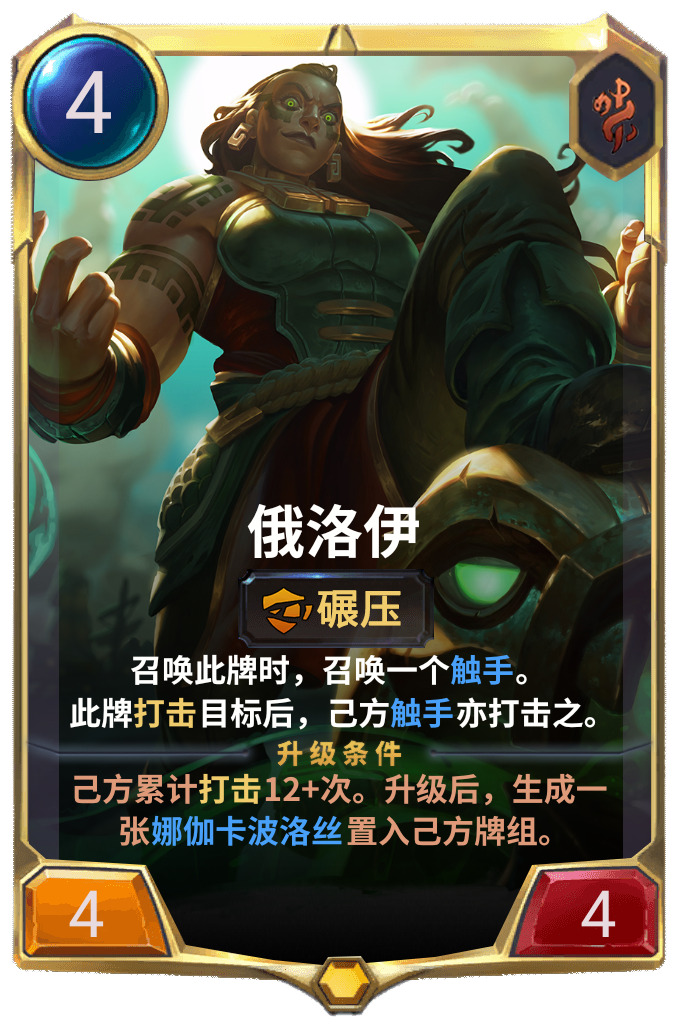 触手详解:己方Lv2的俄洛伊在场上时,己方触手具有+1|+1,也就是每有一个触手堆叠,触手就+2攻击力。但是若己方给一个友军+1|+0时选择了己方触手,则只会在原来基础上给己方堆叠的触手+1攻击力,而不是每个触手都加+1攻击力。也就是说,己方给堆叠的触手增益时,是将堆叠的触手视为一个单位,而不是给每个触手都施放该效果。