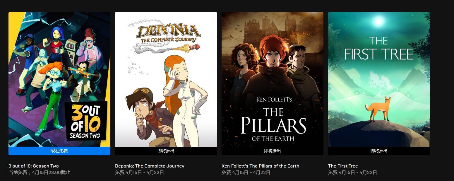 本周Epic商城将送出冒险游戏《3 out of 10:Season Two》,本作的领取时间截止至4月15日。下周Epic将送出《德波尼亚:完整旅程》、《圣殿春秋》以及《第一棵树》三款游戏,感兴趣的玩家不要错过。