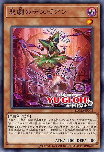 ①:这张卡被效果送去墓地的场合或者被效果除外的场合才能发动。从卡组将「悲剧的デスピア 」以外的1只「デスピア 」怪兽加入手牌。