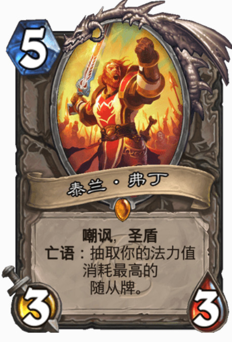 其余卡位选择了与法强配合十分优秀的莱斯·霜语、用来补充资源的导师火心以及用来检索终极随从的泰兰·弗丁。值得一提的是,弗丁在提供圣盾嘲讽护脸的同时,由于卡组高费随从都十分关键且数量稀少,随着回合数的提升,弗丁可以一直保持较高的收益期望,通俗地说,当终极随从射手可以检索莱斯·霜语(群伤返场),莱斯·霜语射手可以检索布鲁坎(OTK斩杀)。