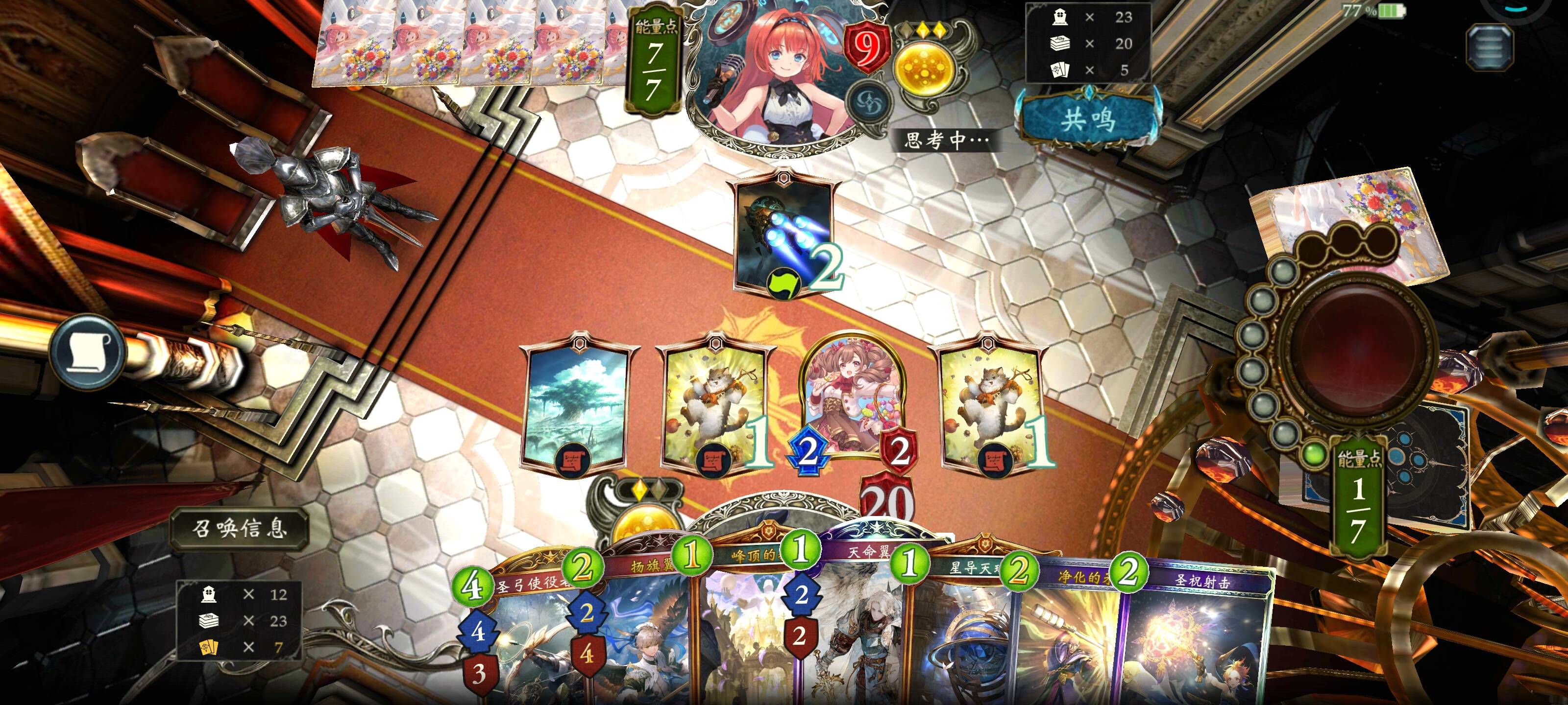 必留天命翼骑,1c天球仪配合2c天命翼骑加天球仪或喵鲁登场,回合结束形成的33无论先手还是后手都能对对手形成不小的压力,同时自己也仍拥有充足资源,这种情况下可以考虑留下贴贴教会等配合喵鲁打伤害。